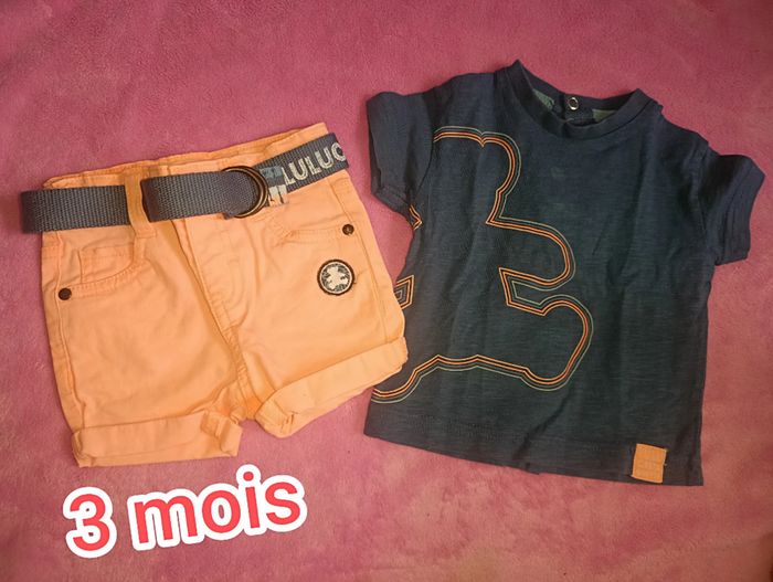 Short orange corail très bon état marque lulu castagnette Et t shirt bleu marine et dessin orange corail ouverture entièrement dans le dos très bon état.