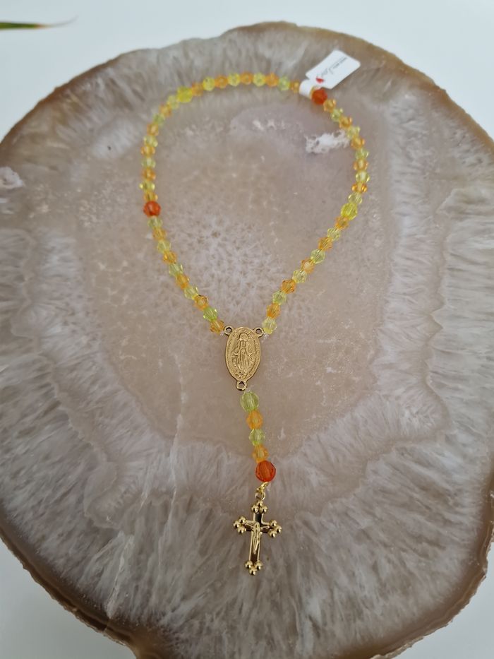 -Petit chapelet de voiture, de sac, avec des perles oranges, jaunes, vierge est croix en acier doré. Joli chapelet avec: -perles toupie a facettes oranges -perles toupie a facettes jaunes -grand connecteur vierge en acier doré -grand pendentif croix jésus en acier doré -Chapelet pour accrocher au rétroviseur de voiture ou autres -Chapelet de poche -Chapelet de sac -Chapelet non conçu pour être porter au cou Taille collier et poids: -Longueur chapelet 20 cm avec le pendentif -Longueur pendentif 2 cm -Largeur pendentif 1,5 cm -Le collier sera livré dans son écrin. -L'article sera emballé avec soins et expédié avec soins. Pour la livraison : -Mondial Relay 24h après achat!