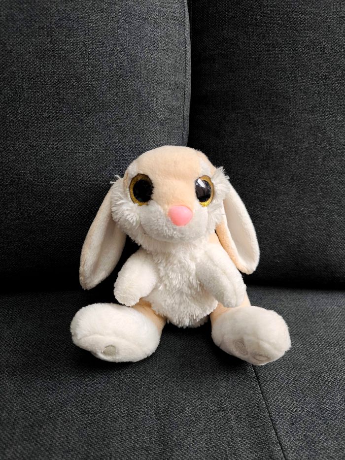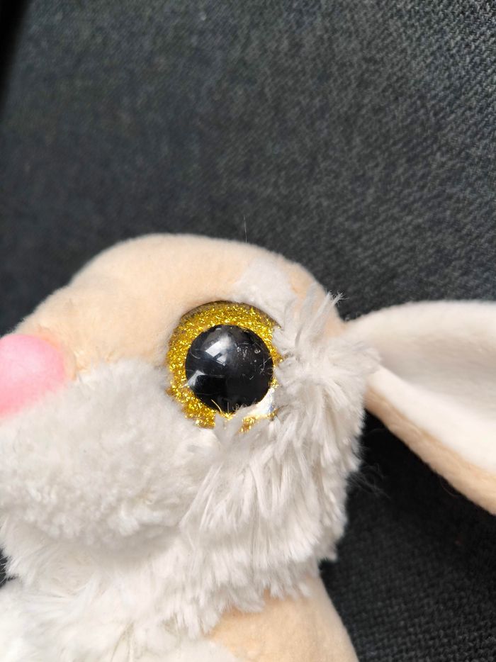 Peluche lapin environ 20 cm Très bon état juste les yeux abîmés ( voir photo )