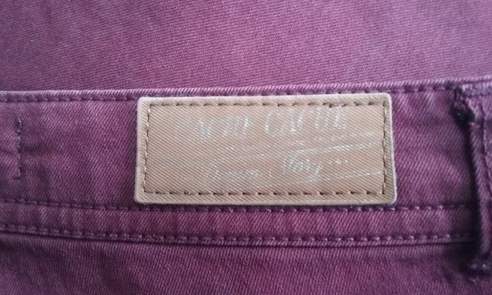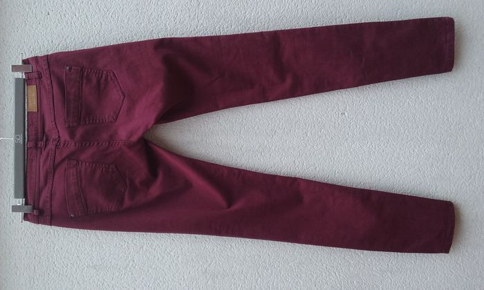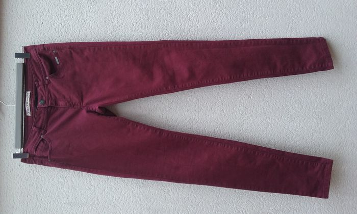 Pantalon slim, taille 36 mais peut également convenir à un 38, 66% coton-31% polyester-3% élasthanne, coloris bordeaux.