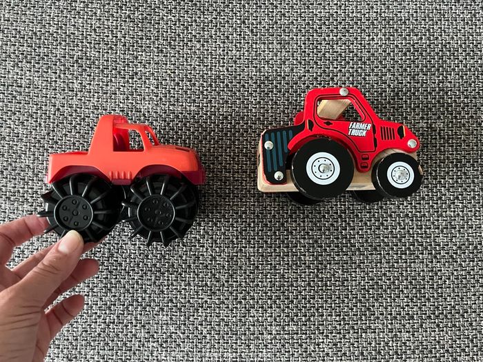 Lot de 2 trucks 1 en plastique L’autre en bois, quelques petites traces d’accroc #jessicaeden78jouets