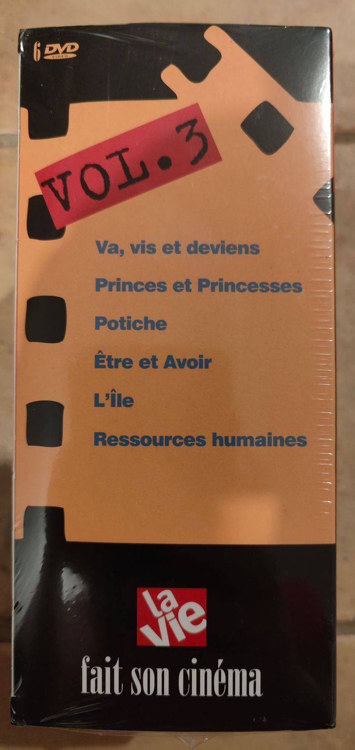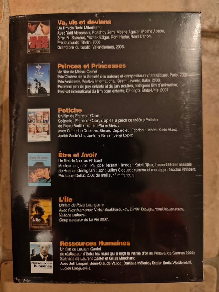 Coffret neuf, d'origine, dans son film plastique d'origine. Ce coffret regroupe une sélection de 6 films choisis par la rédaction du magazine La Vie. Il propose un voyage à travers différents genres cinématographiques (documentaire, animation, comédie, drame) et aborde des thématiques de société, d'humanité et de destin. Les films inclus sont : Va, vis et deviens (2005) de Radu Mihaileanu : Un drame poignant sur le parcours d'un jeune Éthiopien, chrétien, qui se fait passer pour juif pour fuir la famine et rejoindre Israël. Princes et Princesses (1989) de Michel Ocelot : Un chef-d'œuvre d'animation en théâtre d'ombres, où deux jeunes amis inventent et incarnent diverses histoires de princes et princesses dans un monde féerique. Potiche (2010) de François Ozon : Une comédie avec Catherine Deneuve et Fabrice Luchini. L'épouse soumise d'un riche industriel doit prendre les rênes de l'usine familiale après que son mari a fait un malaise, révélant alors une femme d'action insoupçonnée. Être et avoir (2002) de Nicolas Philibert : Un documentaire tendre et captivant qui suit une année scolaire dans une classe unique de campagne, avec un instituteur dévoué. L'Île (titre original : Seom) (2000) de Kim Ki-duk : Un thriller dramatique coréen qui explore la relation étrange et violente entre une jeune femme qui gère des cabanes de pêche flottantes et un homme en fuite. Ressources humaines (1999) de Laurent Cantet : Un drame social qui suit un jeune homme revenant dans son village natal pour un stage en ressources humaines, se retrouvant confronté à son père, un ouvrier dans la même usine.
