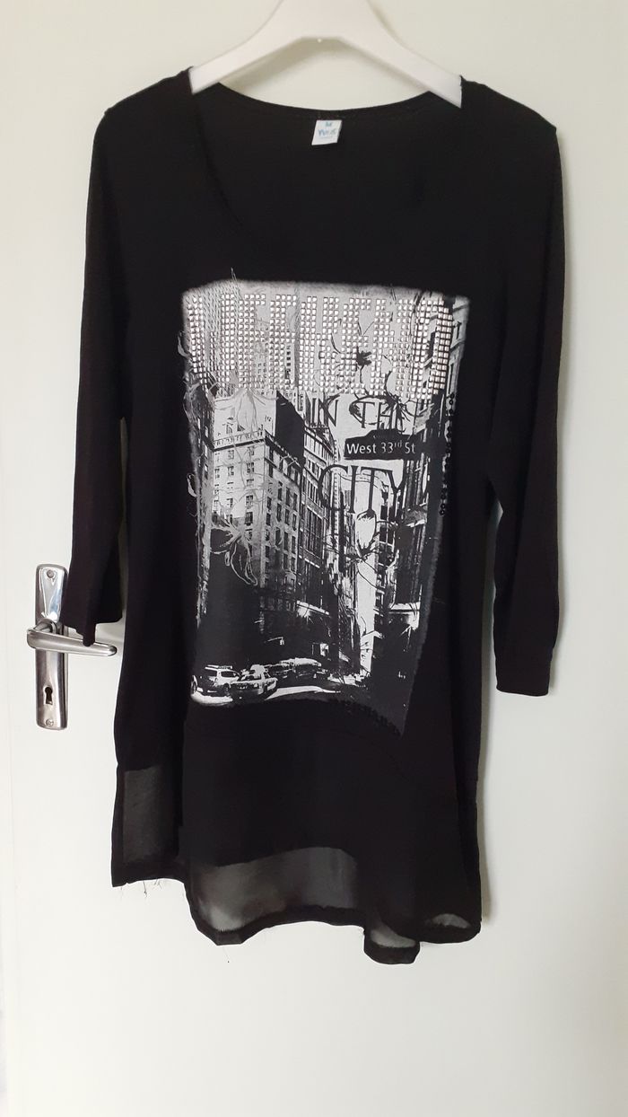 Vends une tunique 50 % coton, 50 % viscose, manches longues, voile à la base, couleur noir avec inscriptions en métal argenté devant, marque M&S Mode, taille M sur étiquette mais correspond plutôt à une taille 40-42. Longueur dans le dos : 76 cm.