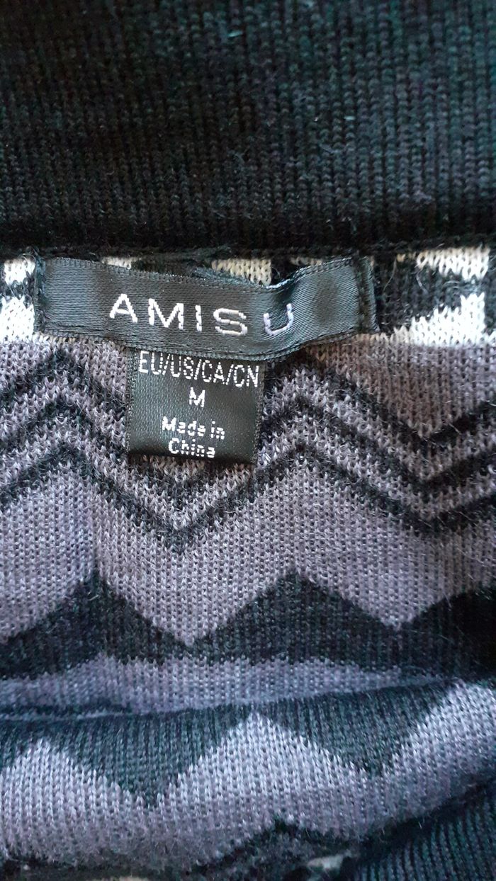 Vends une jupe courte en maille non doublée, noire à motifs gris et blancs, marque Amisu, taille M (EUR). Longueur : 42 cm