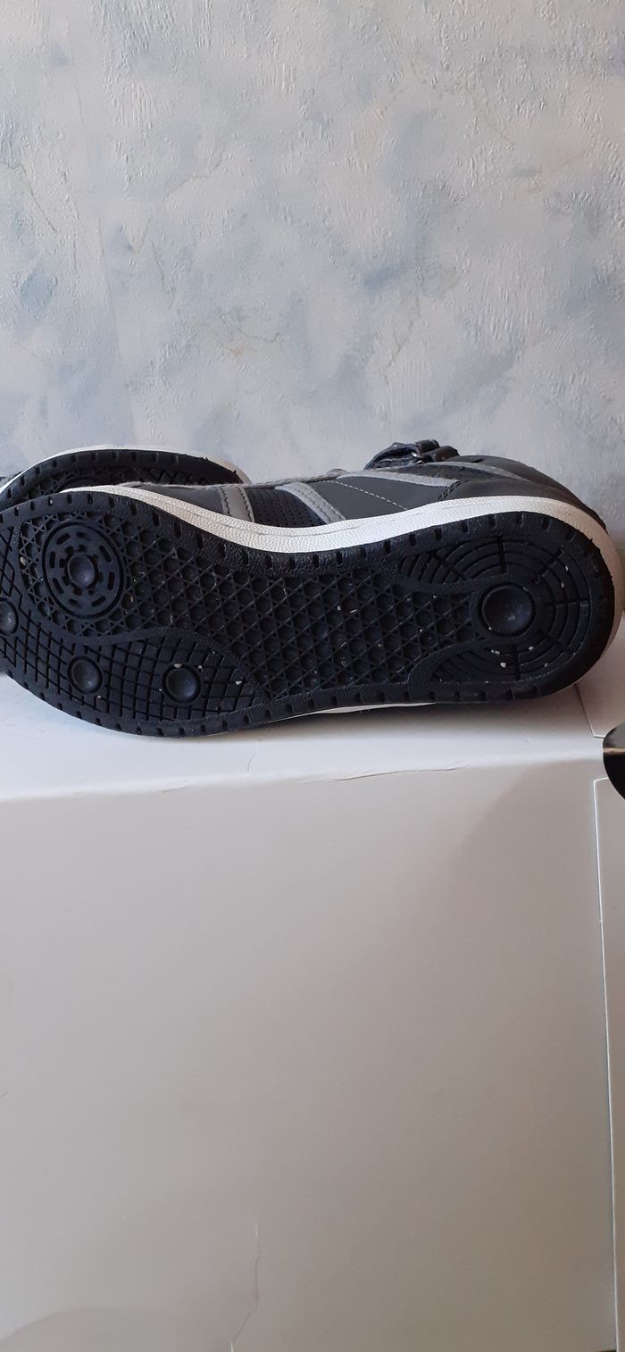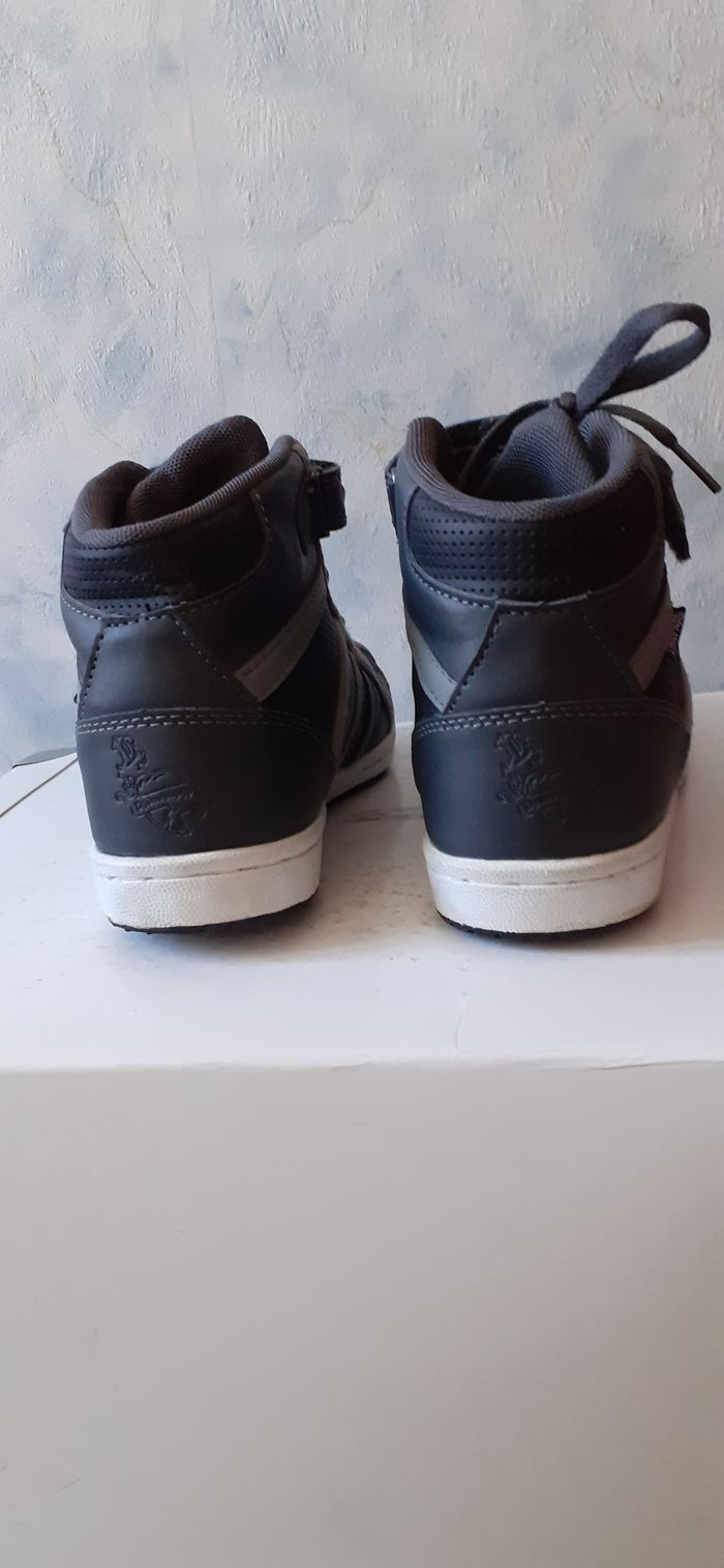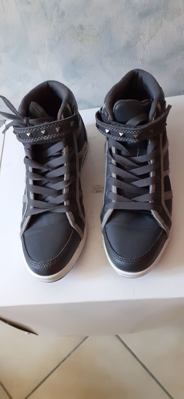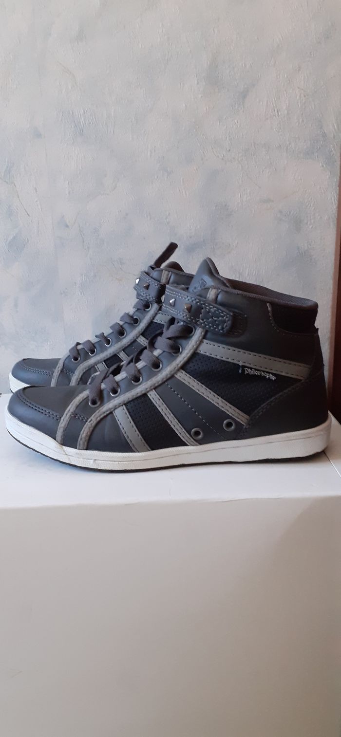 Vends une paire de baskets montantes, en simili cuir et tissu, lacets et scratch sur le devant du pied, couleur grises, très légères, marque Philov'Sophie, pointure 37 sur l'étiquette mais taille petit.