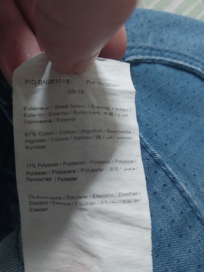 Joli pantalon slim bleu en coton stretch, confortable et près du corps. Motif micro-perforé sur toute la surface et bouton doré pailleté pour une touche originale ✨ Coupe skinny, tissu souple, poches avant et arrière. Taille 12 ans (152 cm). Composition : 87 % coton, 11 % polyester, 2 % élasthanne. Bon état général 👍 💙 Facile à assortir avec un t-shirt, un pull ou une chemise. #tapealoeil #pantalonfille #jeanfille #skinny #12ans