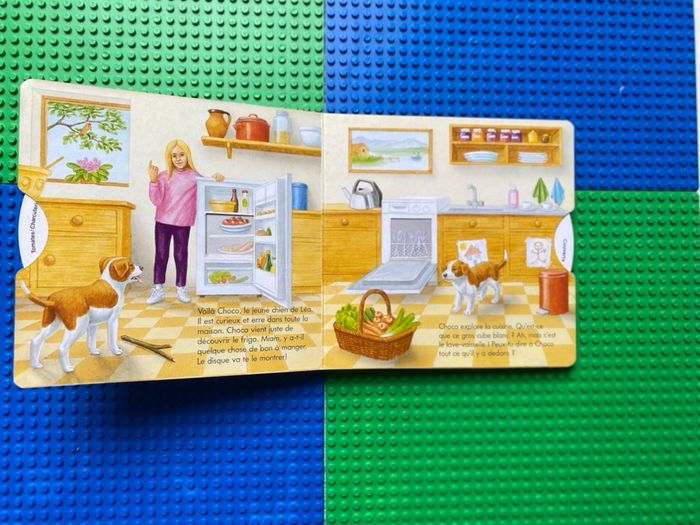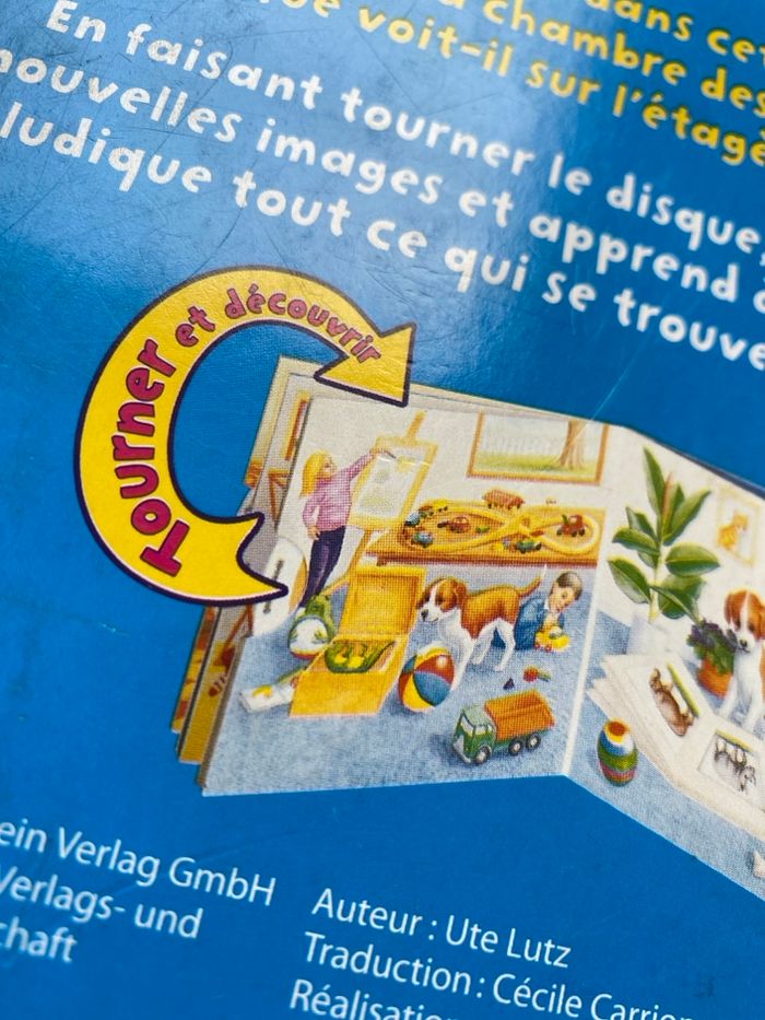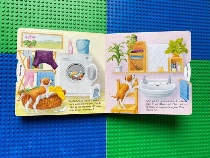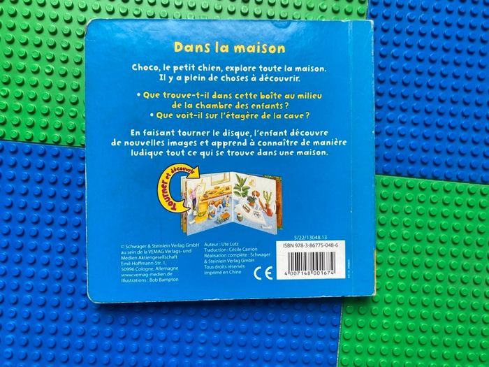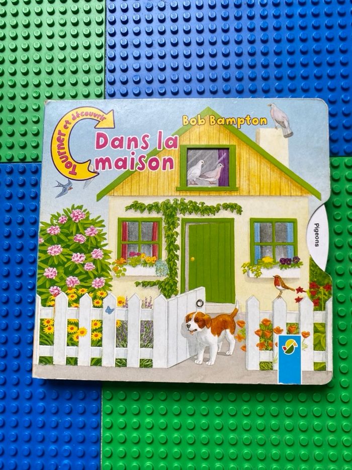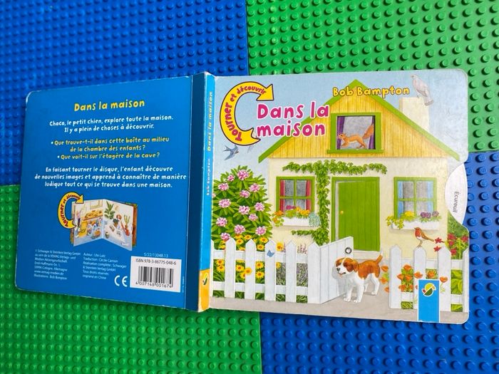 Livre cartonné Dans la maison Bob Bampton Tourner les disques et découvrir . Choco le petit chien explore toute la maison. Il y a plein de choses à découvrir. Que trouve-t-il dans cette boîte au milieu de la chambre des enfants ? Que voit-t-il sur l'étagère de la cave ? En faisant tourner le disque, l'enfant découvre de nouvelles images et apprend à connaître de manière ludique, tout ce qui se trouve dans une maison. Bon état car légèrement abîmé dans les coins extérieurs, voir sur photos.