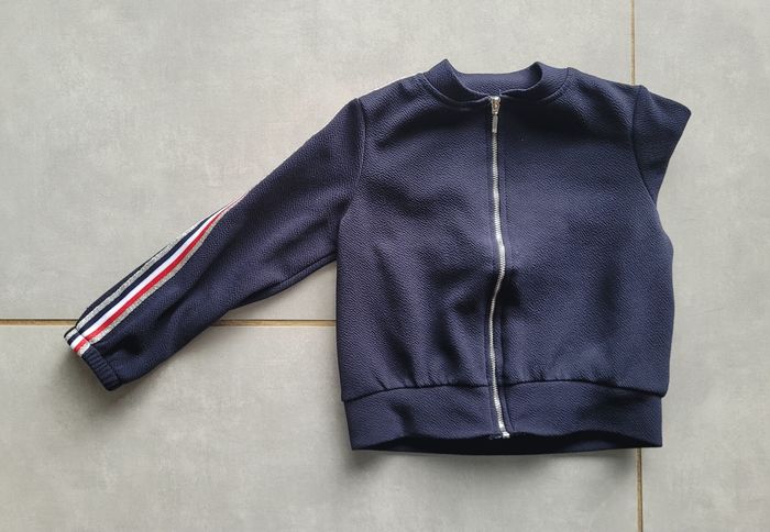 Gilet léger, de couleur marine avec liseré sur les manches argenté bleu blanc rouge, de la marque Gémo, taille 4 ans, en très bon état. Article lavé pour la vente.