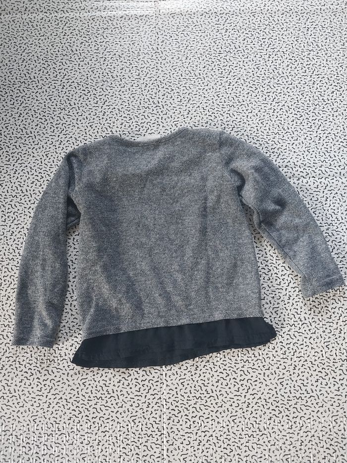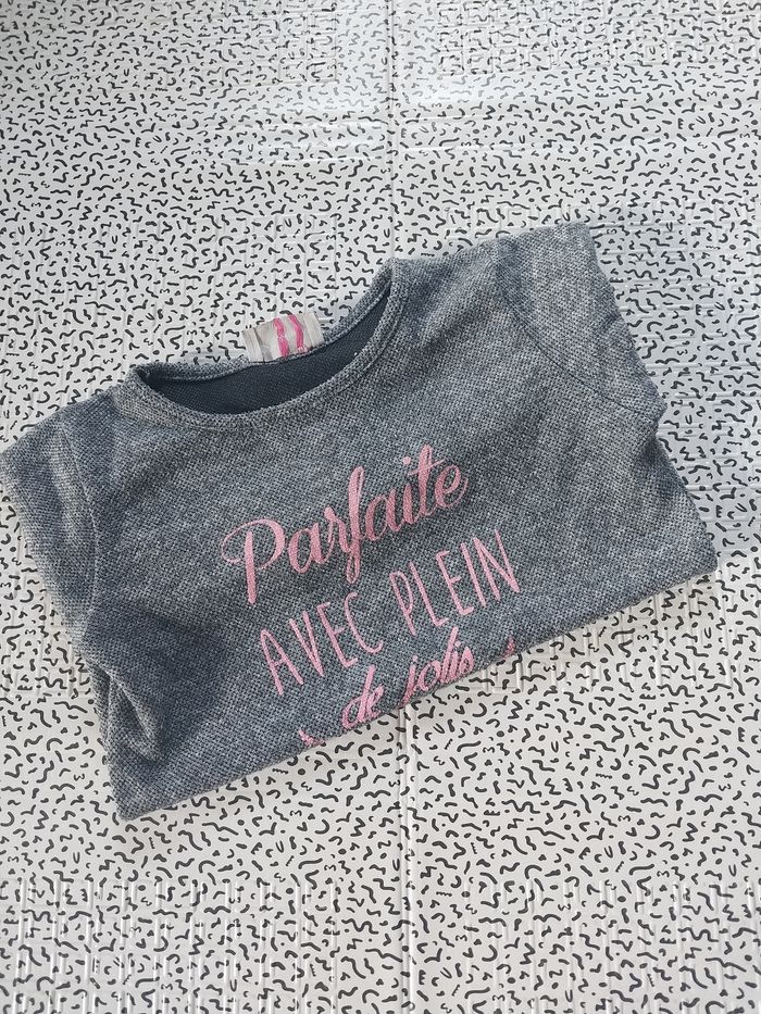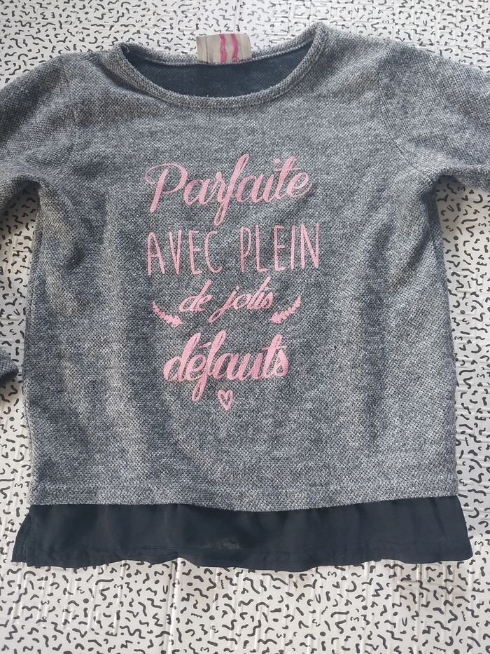 Texte : « Parfaite avec plein de jolis défauts 💗» Joli sweat gris chiné à message rose clair, avec bas volanté noir façon chemisier. Confortable et plein de style, idéal pour la mi-saison 🌸 🧒 Taille : 4 ans (104 cm) 📏 Composition : 88 % polyester, 10 % viscose, 2 % élasthanne – empiècement 100 % polyester ✨ État : bon état, porté quelques fois 👕 Marque : Charlie & Prune 💌 Envoi rapide et soigné #charlieetprune #sweatfille #vetementfille #fille4ans #pullfille