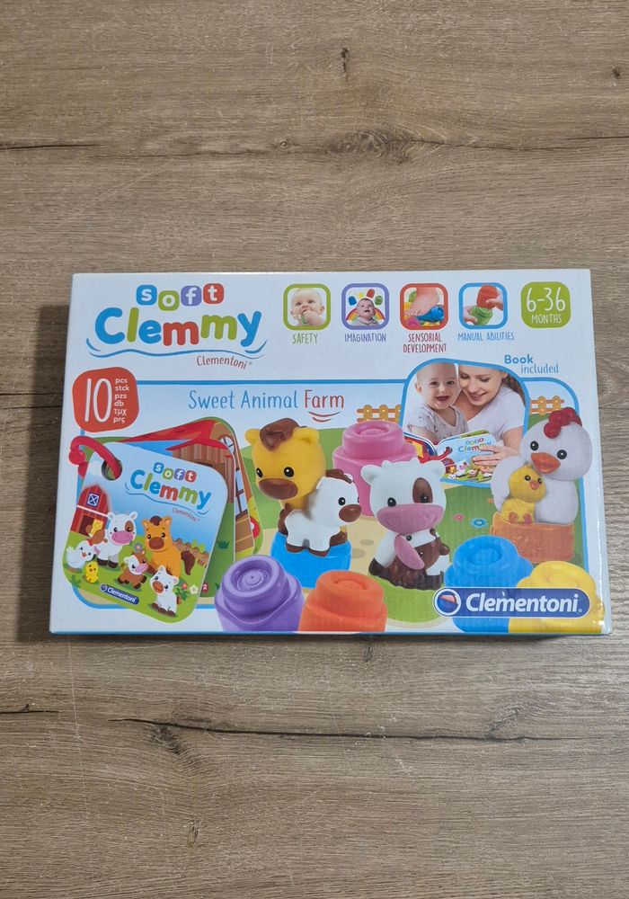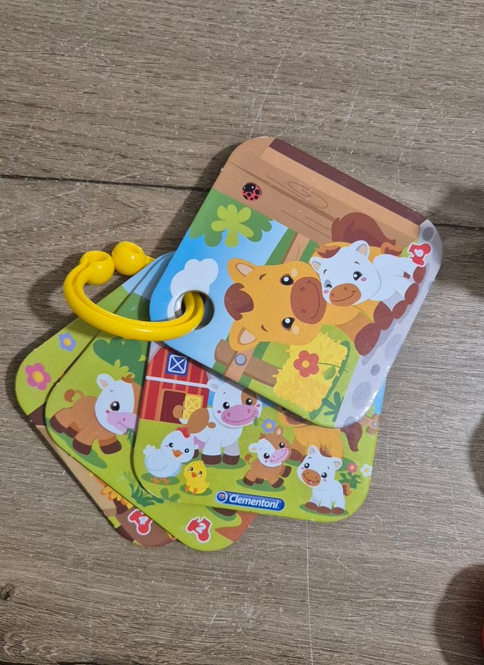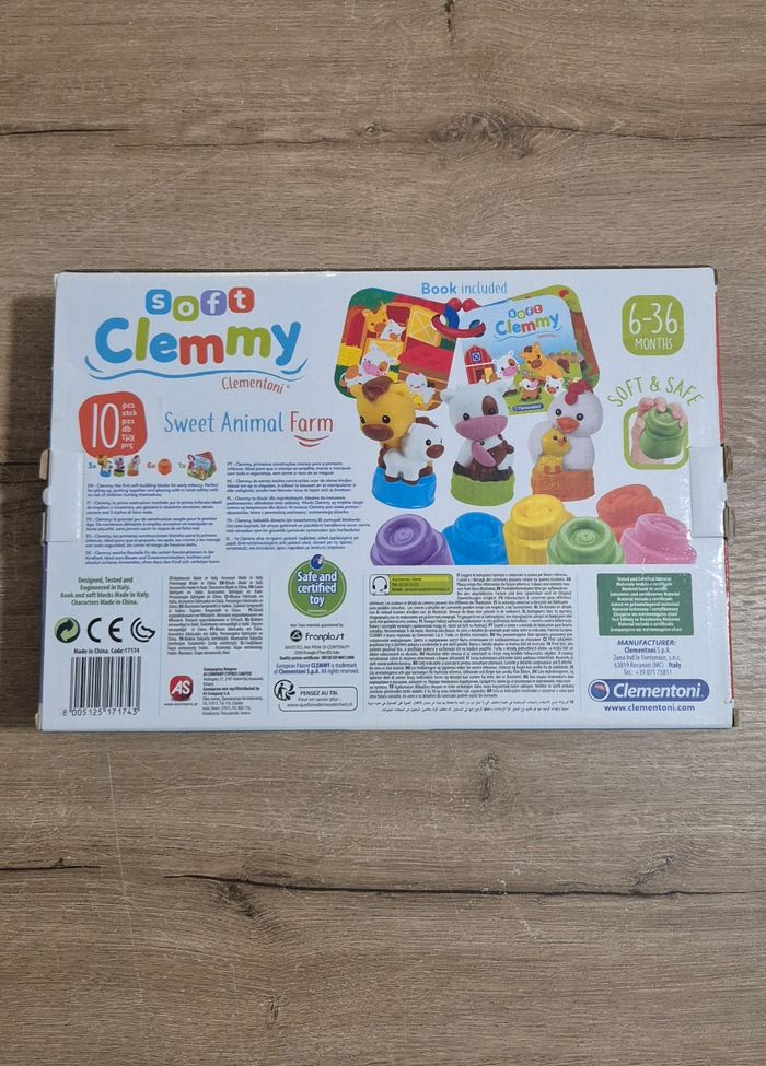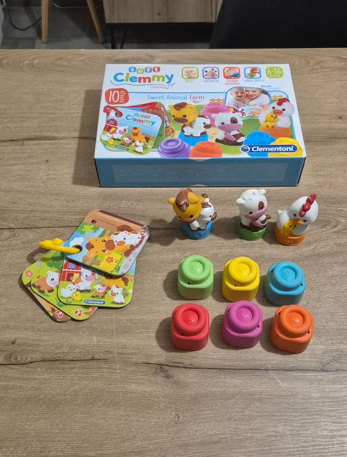 Jeu de construction Soft Clemmy incluant 6 cubes souples et 3 animaux de la ferme à empiler (poule, vache, cheval) et un petit livre Clementoni Parfait état