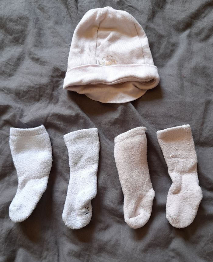 POSSIBILITÉ DE DIVISER LE LOT: * 1 bonnet marque Brioche 1 mois * 1 leggings à pois marque Brioche 1 mois * 2 bodies manches longues NAISSANCE * 2 paires de chaussettes assez épaisse taille 14