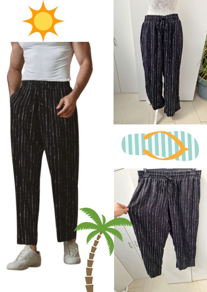 Pantalon Léger Fin Fluide Noir Avec Imprimé Blanc. -Pantalon homme -Pantalon taille élastique et lien élastique de serrage -Pantalon avec poches -Pantalon large fluide fin État De L'Article: -Neuf jamais porté Couleur: -Noir/Blanc Taille: - L Dimensions: -Largeur taille 32 cm non étiré et 55 cm étiré au max. -Longueur jambes 102 cm -Largeur de jambes 31 cm Matière : -100% Polyester Pour la livraison : -Mondial Relay 24h après achat!