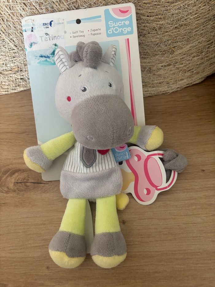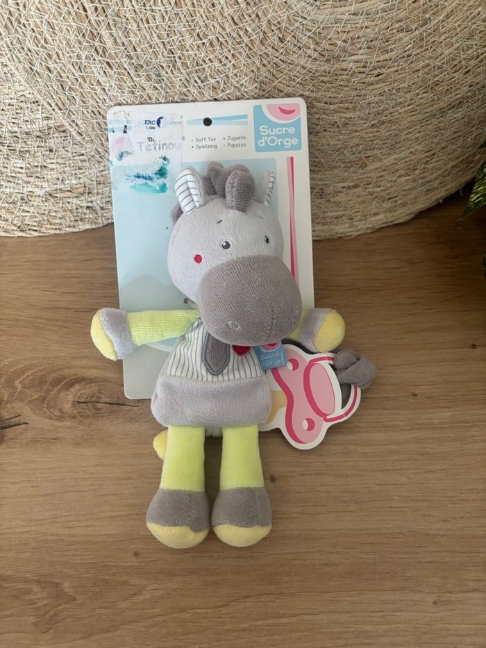Neuf doudou zèbre cheval gris jaune attache sucette sucre d orge