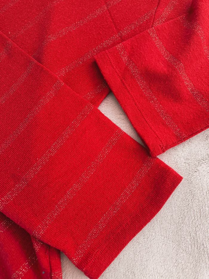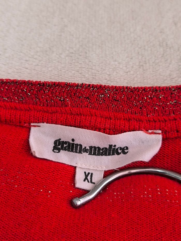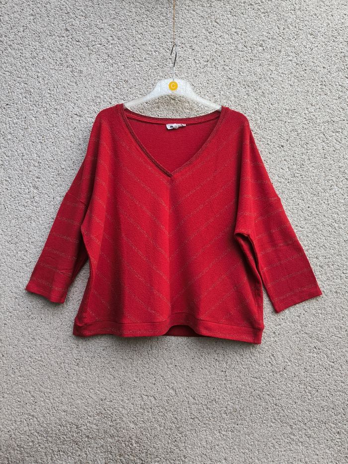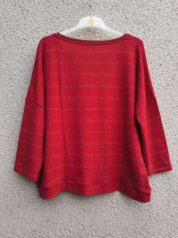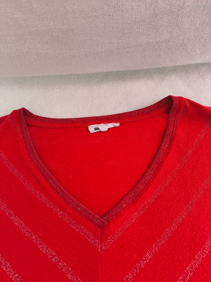 Pull à manches 3/4 Marque Grain de Malice Taille XL, 42 • Coloris rouge, doré • Rayures • Col V • Mailles, stretch • Pull fin • Quelques bouloches Largeur aisselle à aisselle non étirée : 67 cm Largeur aisselle à aisselle étirée au maximum : 107 cm Longueur totale : 65 cm Longueur aisselle : 41 cm En très bon état #evelyne_taille_42