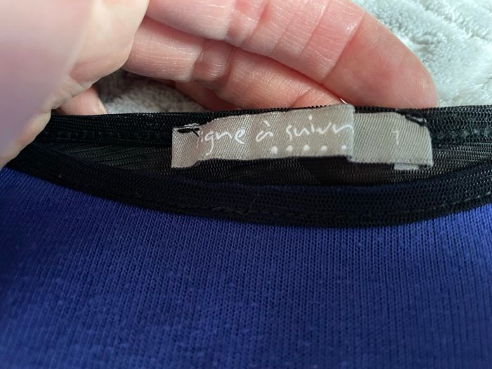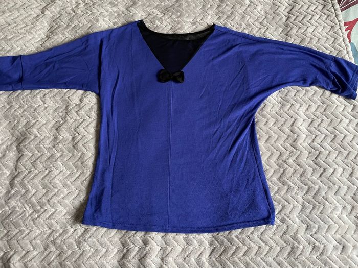 Pull manches 3/4 Bleu pétrole avec motifs dorés Noeud noir dans le dos Taille 1 Marque Ligne à suivre