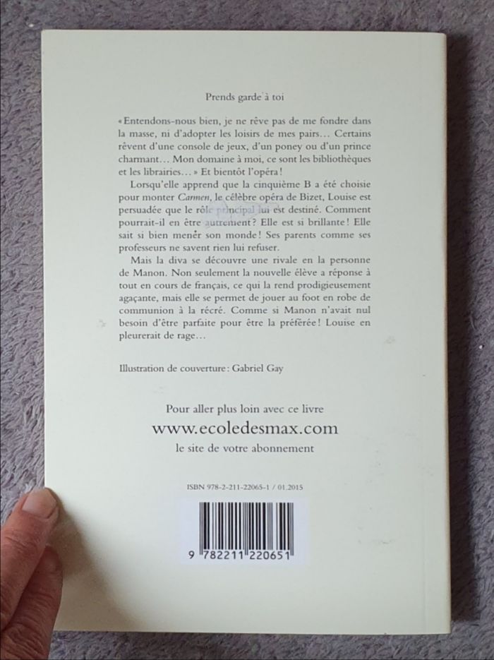 Résumé : «Entendons-nous bien, je ne rêve pas de me fondre dans la masse, ni d'adopter les loisirs de mes pairs... Certains rêvent d'une console de jeux, d'un poney ou d'un Prince charmant... Mon domaine à moi, ce sont les bibliothèques et les librairies...» Et bientôt l'opéra! Lorsqu'elle apprend que la cinquième B a été choisie pour monter Carmen, le célèbre Opéra de Bizet, Louise est persuadée que le rôle principal lui est destiné. Comment pourrait-il en être autrement ? Elle est si brillante! Elle sait si bien mener son monde! Ses parents comme ses professeurs ne savent rien lui refuser. Mais la Diva se découvre une rivale en la personne de Manon. Non seulement la nouvelle élève a réponse à tout en cours de français, ce qui la rend prodigieusement agaçante mais elle se permet de jouer au foot en robe de communion à la récré. Comme si Manon n'avait nul besoin d'être parfaite pour être la préférée! Louise en pleurerait de rage... Date de parution : 28/02/2013. Auteur : Fanny Chiarello. Illustrateur : Gabriel Gay. Collection : Supermax. Éditions : L'École des Loisirs. Dimensions du livre : 12.5x1.6x19Cm. =) 196 pages. Montant d'achat magasin : 10E. État comme neuf.