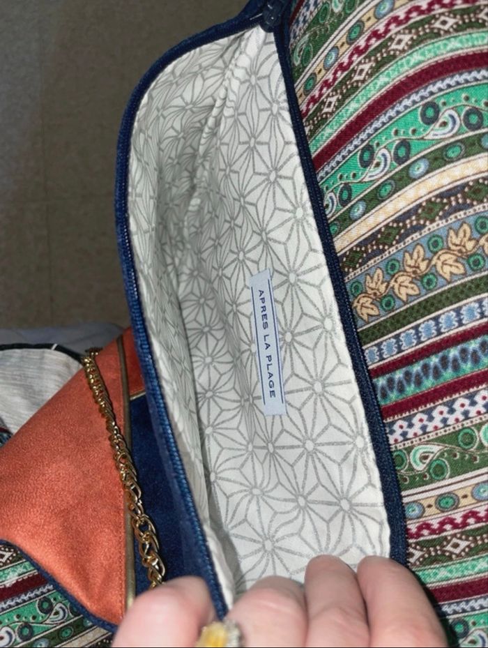 Sac à main Bandoulière Ou pochette La anses en doré style chaîne s enlève Bleu marine et corail Style velours /Daim Après la plage Neuf