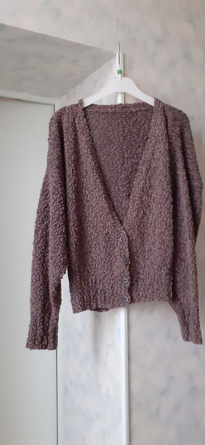 Vends un gilet en maille bouclette en coton et acrylique, court et large, manches larges et resserrées aux poignets, 4 boutons vert foncé, couleur taupe, taille 38. Longueur dans le dos : 55 cm.