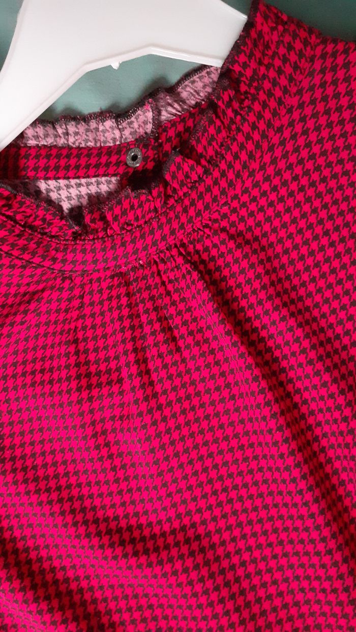 Vends un chemisier manches longues, en viscose, petit volant à la base, au col et aux poignets, couleur rouge avec petits motifs pied de poule noir, marque Pimkie, taille 42. Longueur de l'épaule à la base : 56 cm Largeur aisselle à aisselle : 52 cm.