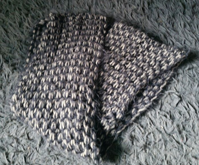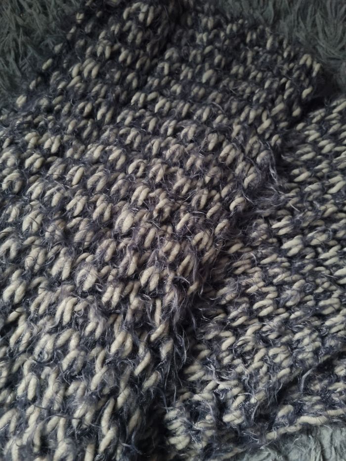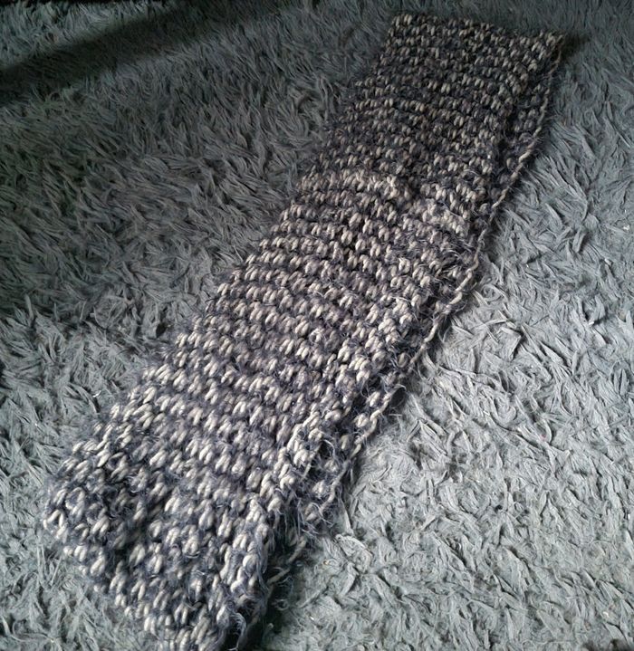 Écharpe cache cou gris clair et foncé, style tricot, longueur 74cm, largeur 18cm.