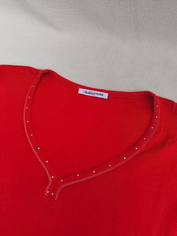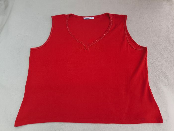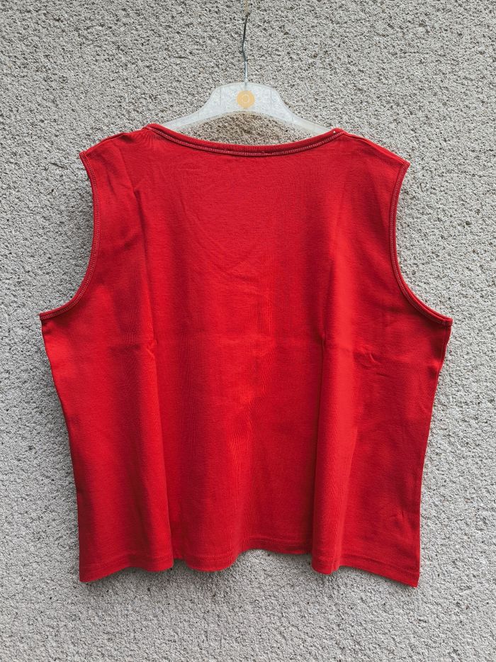 Débardeur à larges bretelles Marque Christine Laure Taille 5, 50-52 • Coloris rouge • Col V avec strass argentés • Coton fin, stretch • Petites taches Largeur aisselle à aisselle non étirée : 61 cm Largeur aisselle à aisselle étirée au maximum : 105 cm Longueur totale : 59 cm Longueur aisselle : 38 cm Également disponible en bleu Peu porté, en très bon état #evelyne_taille_50 #evelyne_taille_52