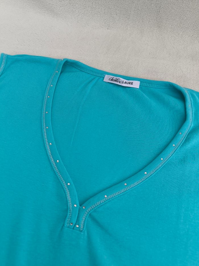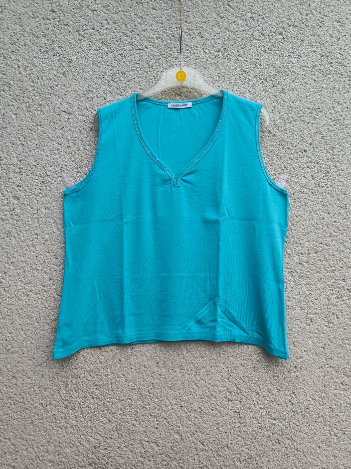 Débardeur à larges bretelles Marque Christine Laure Taille 5, 50-52 • Coloris bleu clair • Col V avec strass argentés • Coton fin, stretch Largeur aisselle à aisselle non étirée : 57 cm Largeur aisselle à aisselle étirée au maximum : 105 cm Longueur totale : 61 cm Longueur aisselle : 40 cm Également disponible en rouge Peu porté, en très bon état #evelyne_taille_50 #evelyne_taille_52