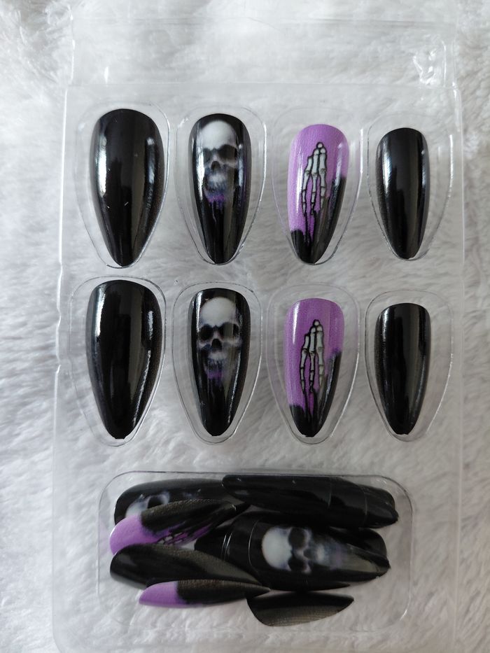 Ensemble de Faux ongles pour Halloween 24 pieces Noir et violet en forme d'Amande avec un fini brillant Design fumé avec des crânes et des os Amovibles pour Manucures Élégantes Spécial Halloween Nail Art Durable