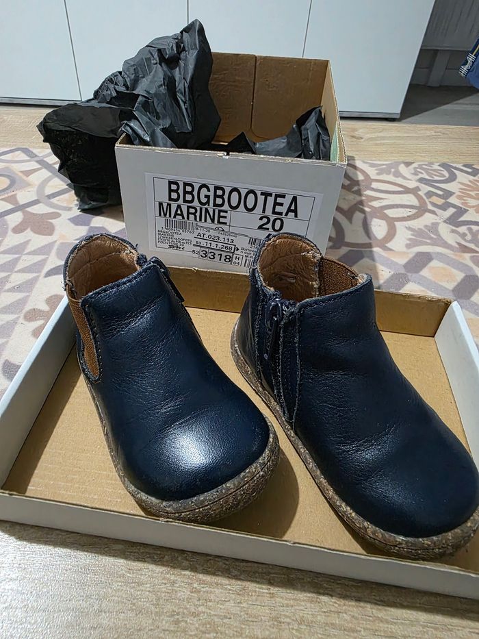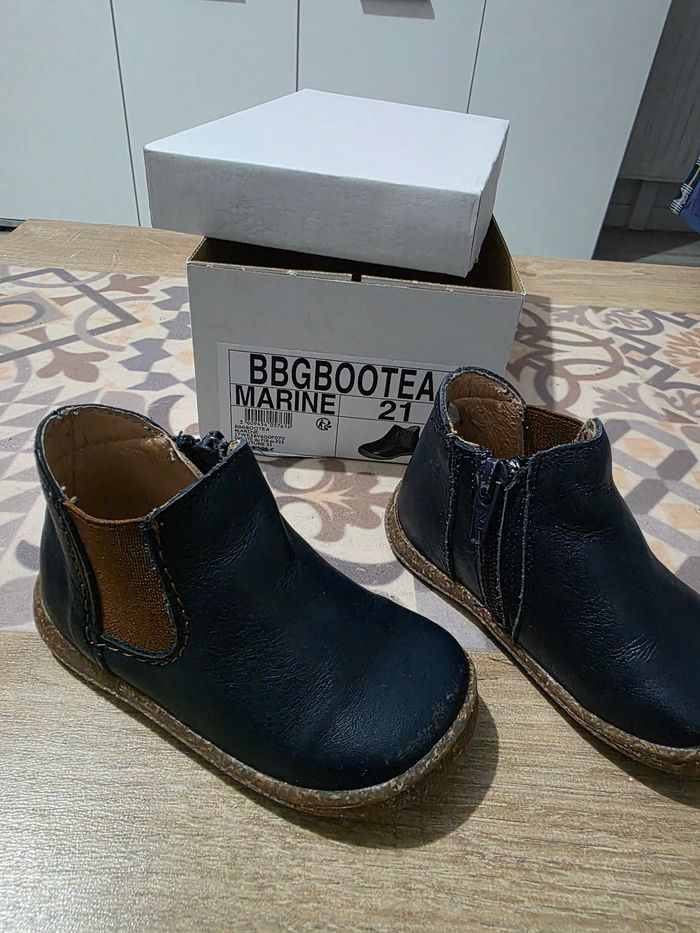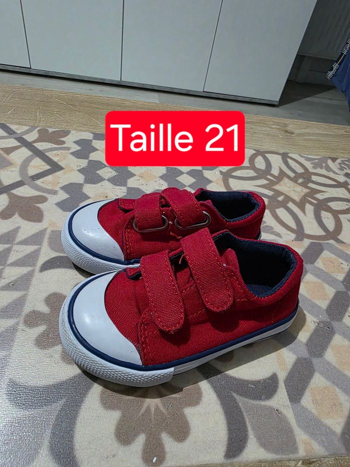 Je vends ce lot de 4 paires de chaussures pour enfant, couvrant les tailles 20 et 21. Le lot comprend : Bottines Bellamy (Taille 20) : Superbes bottines bleu marine, modèle "BBGBOOTEA". Avec zip et élastique marron (style Chelsea). Vendues dans leur boîte. Bottines Bellamy (Taille 21) : La MÊME paire que ci-dessus, en taille 21. Parfait pour avoir la taille suivante sous la main ! Vendues dans leur boîte. Baskets toile Rouge (Taille 21) : Baskets montantes avec double scratch, très pratiques. Claquettes Snoopy (Taille 22) : Adorables sandales/claquettes jaunes "PEANUTS" avec élastique de maintien à l'arrière. Toutes les paires sont en très bon état..