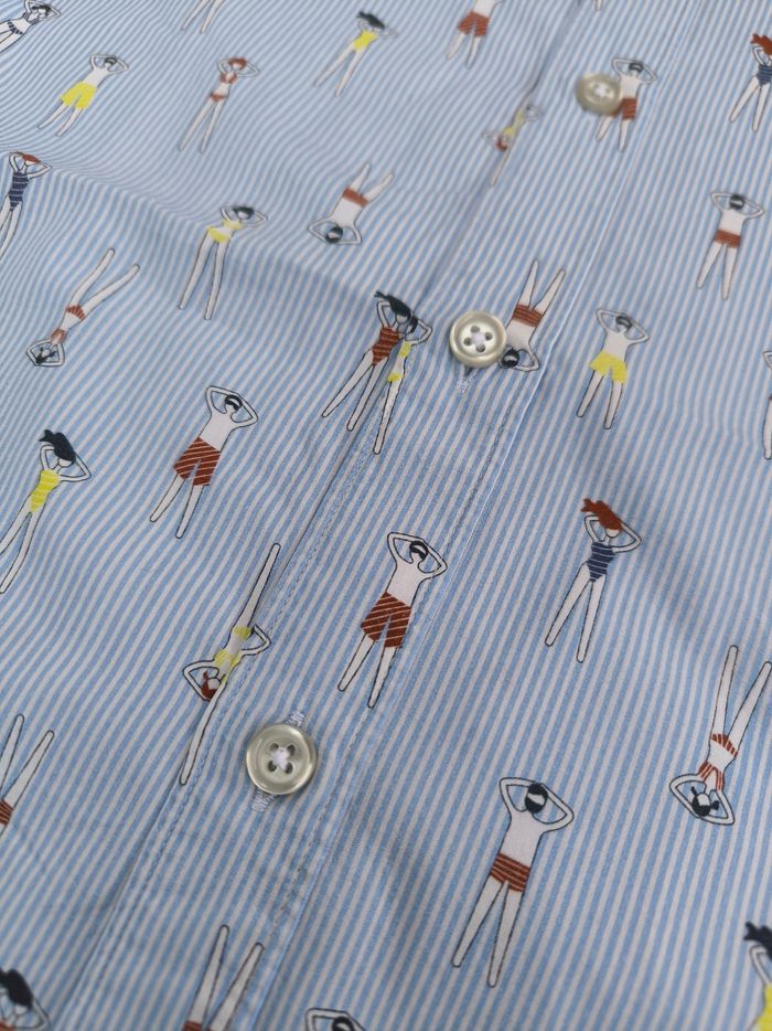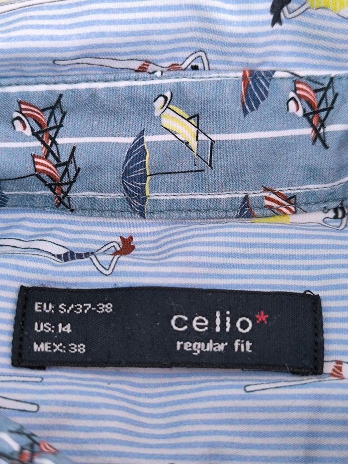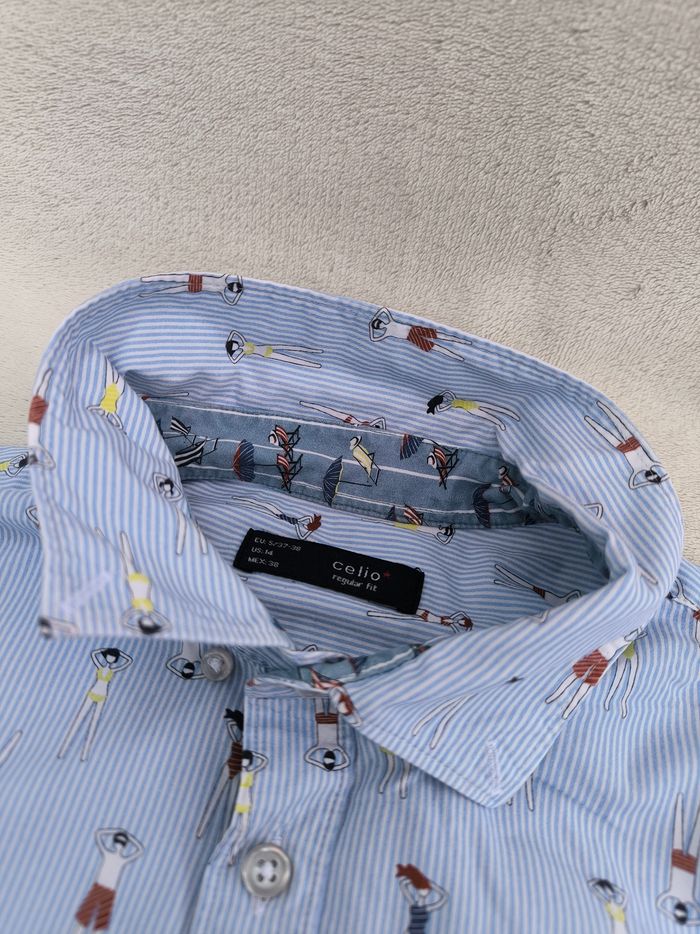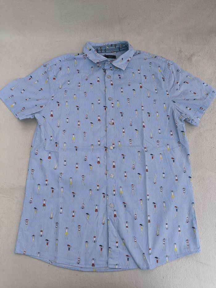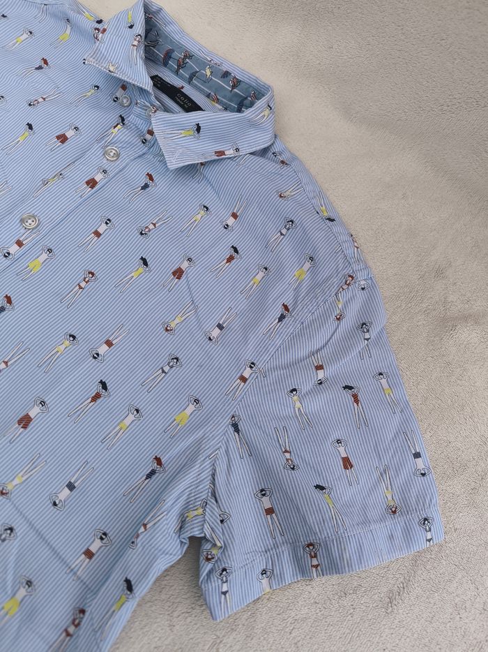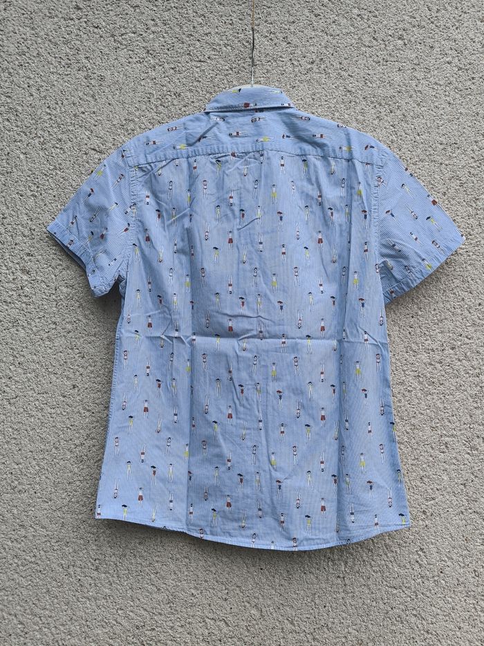 Chemise à manches courtes Marque Celio Taille S-M, 37-38 • Coloris bleu, blanc • Rayures verticales, imprimés personnages, thème plage • Fermeture par boutons • Tissu fin Largeur épaule à épaule non étirée : 44 cm Largeur épaule à épaule étirée au maximum : 46 cm Largeur aisselle à aisselle non étirée : 50 cm Largeur aisselle à aisselle étirée au maximum : 52 cm Longueur totale : 72 cm Longueur aisselle : 40 cm En très bon état #evelynehommes