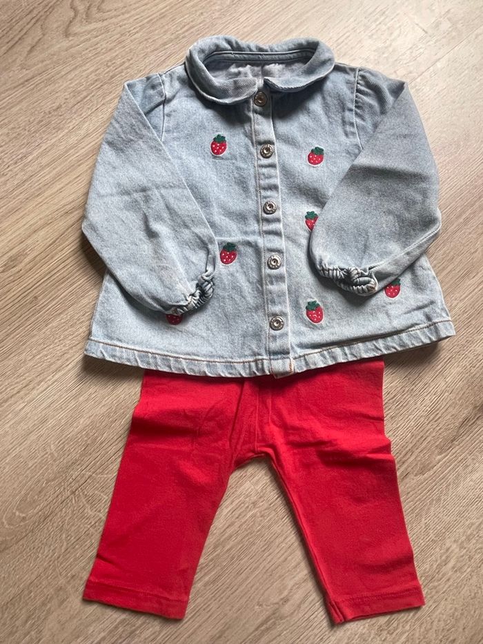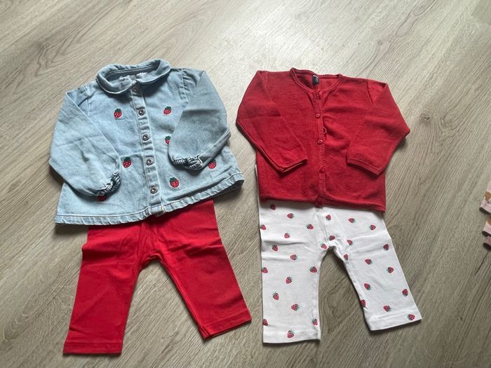 2 ensembles bébé fille Kiabi taille 12-18 mois - 1 gilet rouge + legging court - 1 chemise en jean + legging court 6€/lot Lot divisible