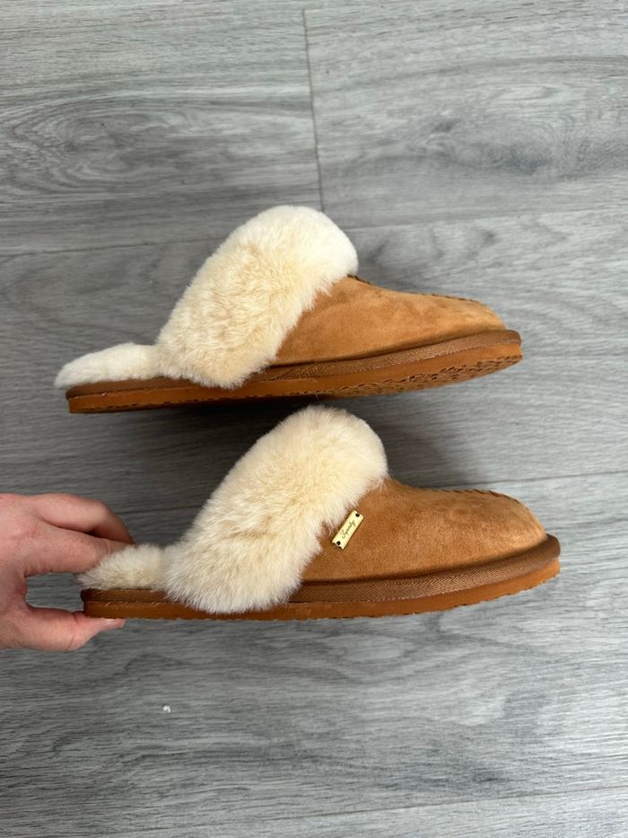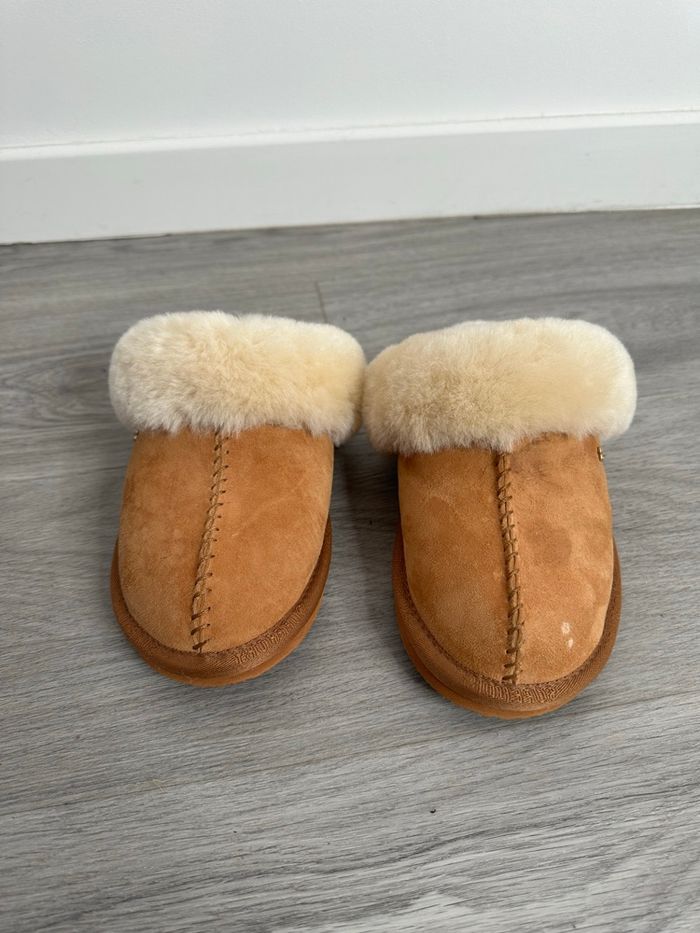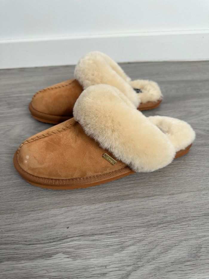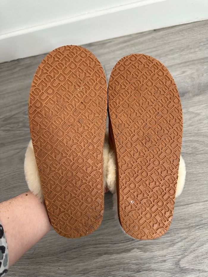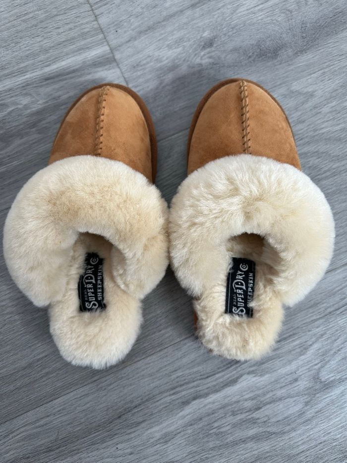 Chaussons mules pantoufles - Excellent état - Pointure 38-39 - Marque Superdry - Camel et blanc - Peau lainée, Sheepskin - Prix d’achat: 89,99€ - Deux petites tâches sur le pied gauche (voir photos)