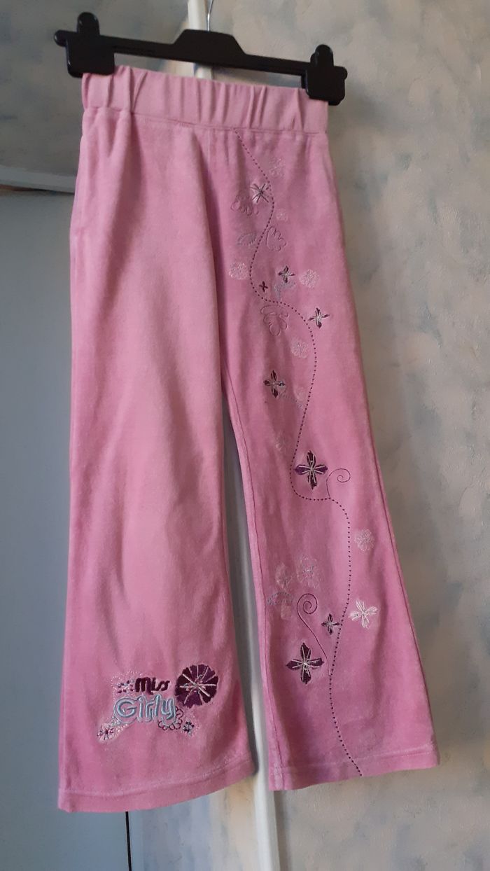Vends un pantalon à jambes larges, en velours, 80 % coton, 20 % polyester, couleur rose avec motifs brodés devant, marque Miss Girly, taille 6 ans (114 cm). Longueur entrejambe : 49 cm.