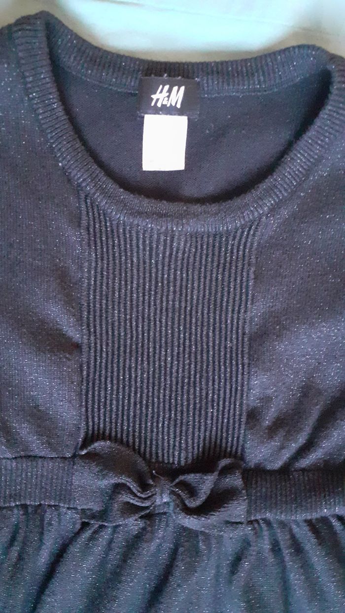 Vends une robe chic manches courtes en maille 35 % polyamide, 25 % viscose, 15 % polyester, cintrée à la taille avec petit noeud devant, couleur noir et argenté, marque H&M, taille 6-8 ans (122-128 cm). Longueur de l'épaule à la base : 65 cm.