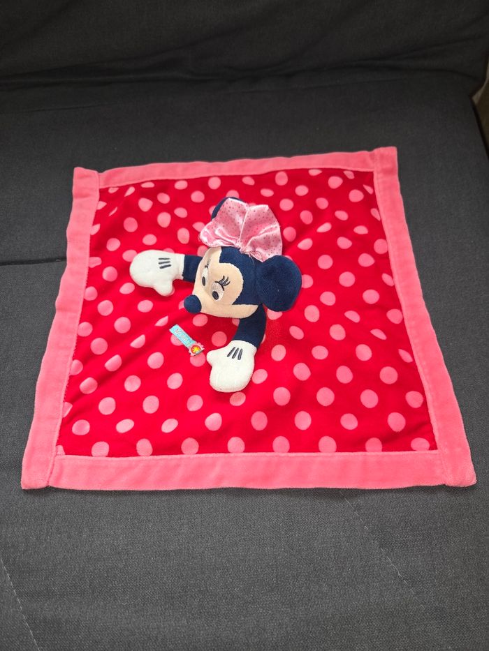 Doudou Minnie carre plat rouge et rose à pois - noeud satin - Disney