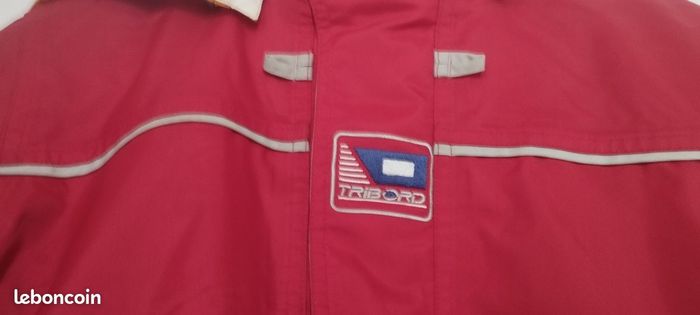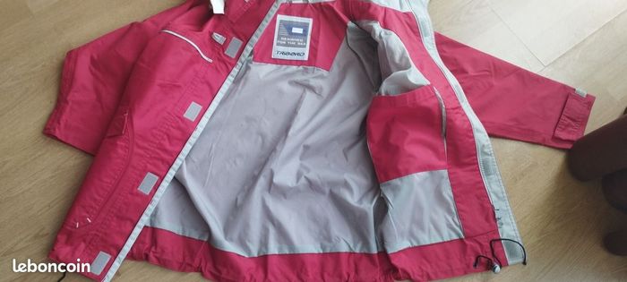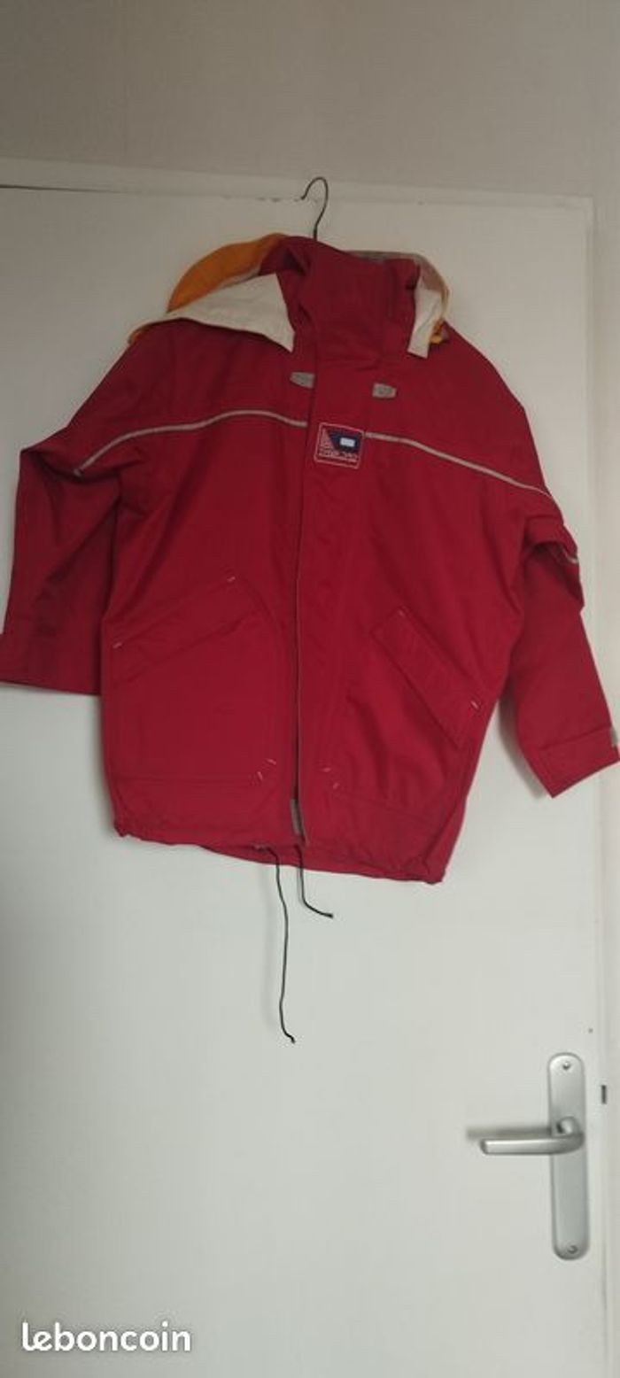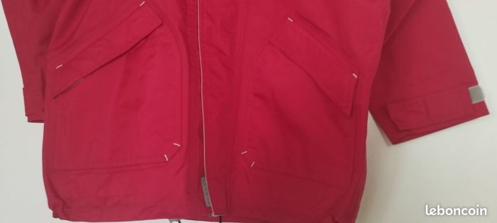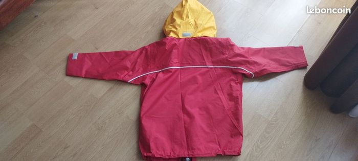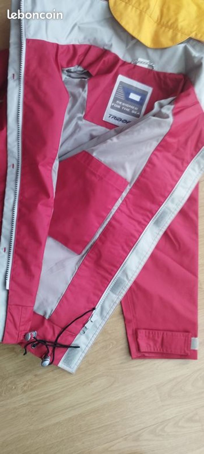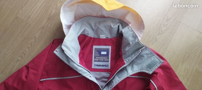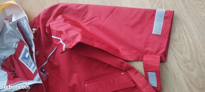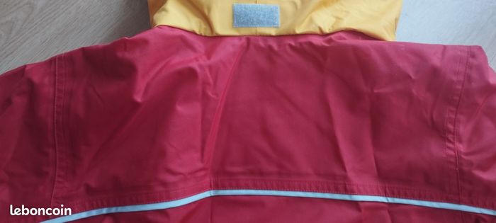 Veste imperméable coupe-vent, Pluie, pour enfants 6ans. Grand col montant plus une capuche visière. Fermeture du cou au bas de la veste par double fermeture : une fermeture éclair et autre par dessus en scratch. 3 poches: 2 grandes sur le devant et à l'intérieur fermées par scratch. Les bas des manches sont réglables : amples ou serrées par scratch. Logo Tribord sur le devant. En Polyamide. Longueur de la veste 59cm. Elle est de couleur Rouge foncé et sa capuche imperméable jaune. Elle est comme neuve !