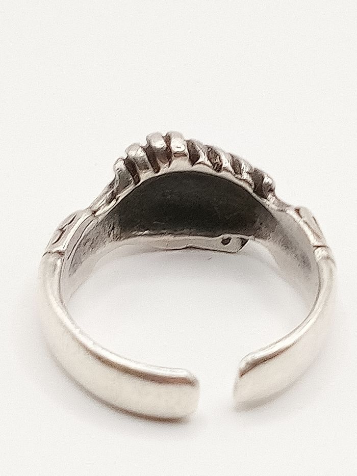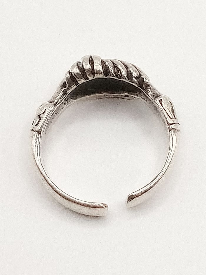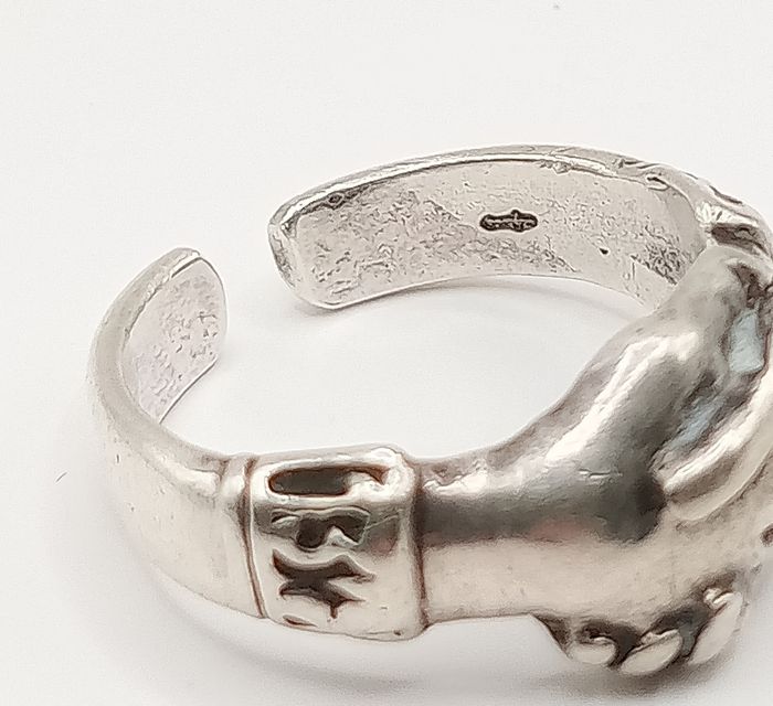 Magnifique bague, la célèbre alliance de Sainte Rita, généralement en or. Deux mains se joignent et se ferment. Argent 925. Taille ajustable grâce à son ouverture en bas, mais à partir de la taille 19,5 mm de diamètre, 59,5 mm de taille US 9 - E.