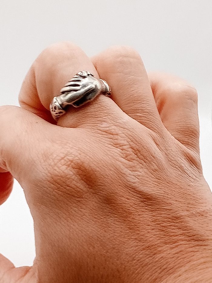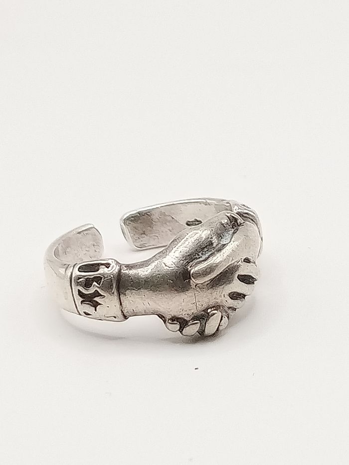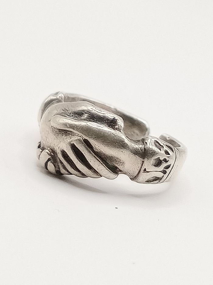 Bellissimo anello, la famosa fede di santa Rita, solitamente realizzata in oro. Due manu che si uniscono e si stringono. Argento 925 misura regolabile in quanto è aperta sotto però a partire dalla misura 19.5 di diametro 59.5 mm misura americana 9 - E.