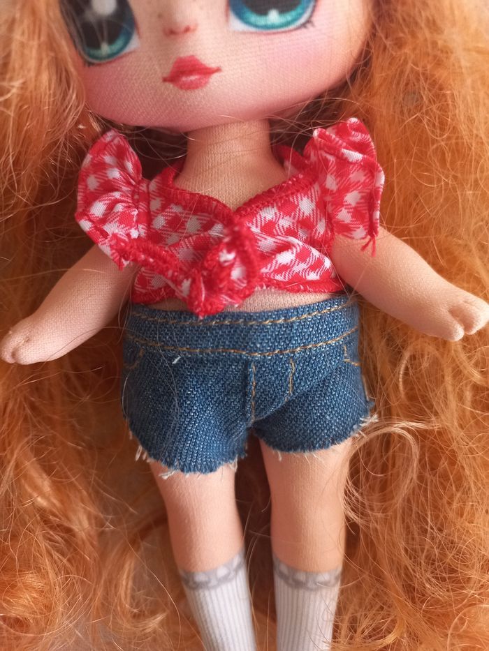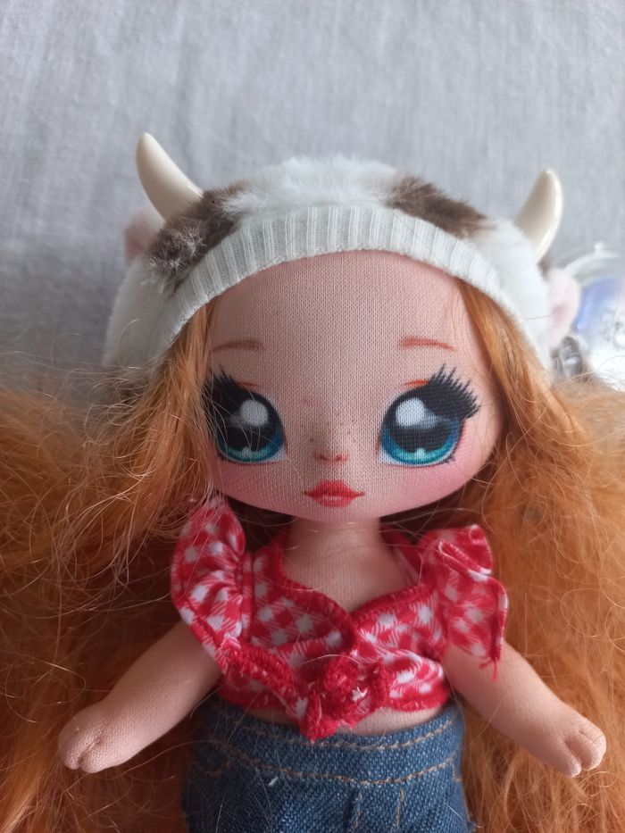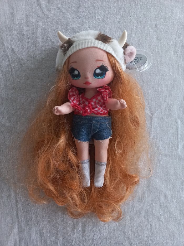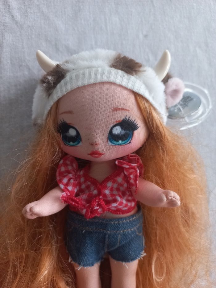 Na Na Na poupée surprise Annabelle Moooshe Cow Série 3 18 cm environ Avec short bleu et haut à carreaux rouge et blanc qui peuvent s'enlever cheveux ondulés fixé au bonnet non amovible tête ; bras et jambe articulés En bon état Manque juste la paire de bottes