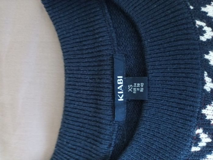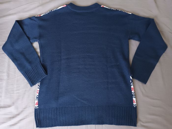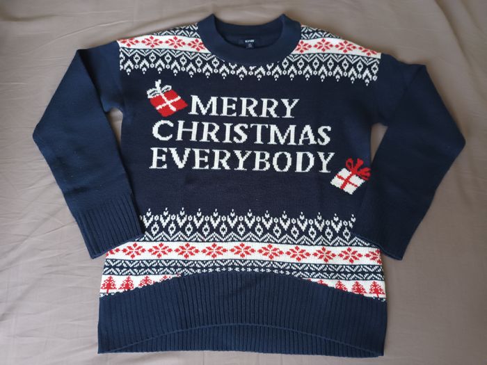 Pull de Noël bleu marine Taille : XS / 34 Marque : Kiabi 100% acrylique Dimensions : _ Largeur des épaules : 52 cm _ Longueur : 59 cm Très bon état, quelques légères bouloches à l'arrière des manches (voir photos)