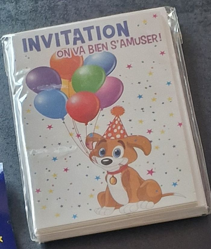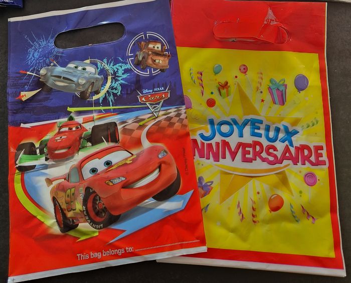 Lot pour célébration d'anniversaire (NEUF avec étiquette) composé de : - 12 identificateurs de verres (4€) - 3 étuis de 3 bracelets lumineux chacun (1,50€ l'étui) - 1 paquet de 10 cartons d'invitation + 10 enveloppes (3€) - 1 sachet de 8 sachets à bonbons ou cadeaux transparents (1,50€) - 3 sachets à bonbons Cars + 3 sachets à bonbons classiques (reliquats de lots mais neufs) (offerts pour l'achat du lot) En cas de souhait d'achat à l'unité, les prix sont indiqués entre parenthèses. Pas d'envoi en-deçà de 4€ par souci écologique. Merci pour votre compréhension.