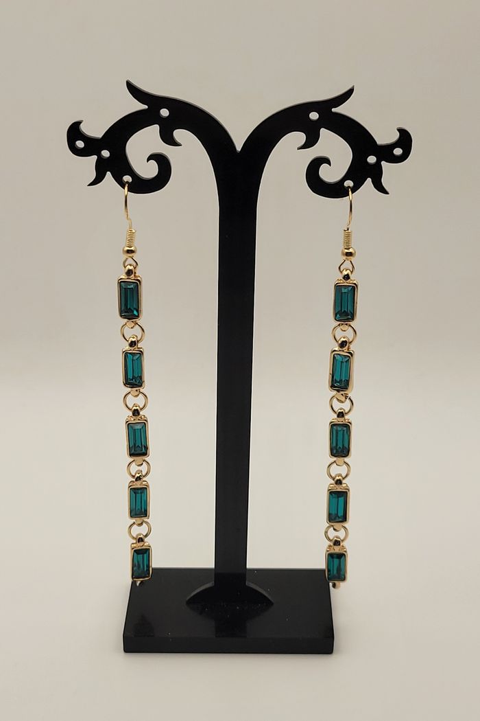 BOUCLES D'OREILLES PENDANTES LONGILIGNE STRASS VERT FONCE ! NEUVE ! - photo numéro 1