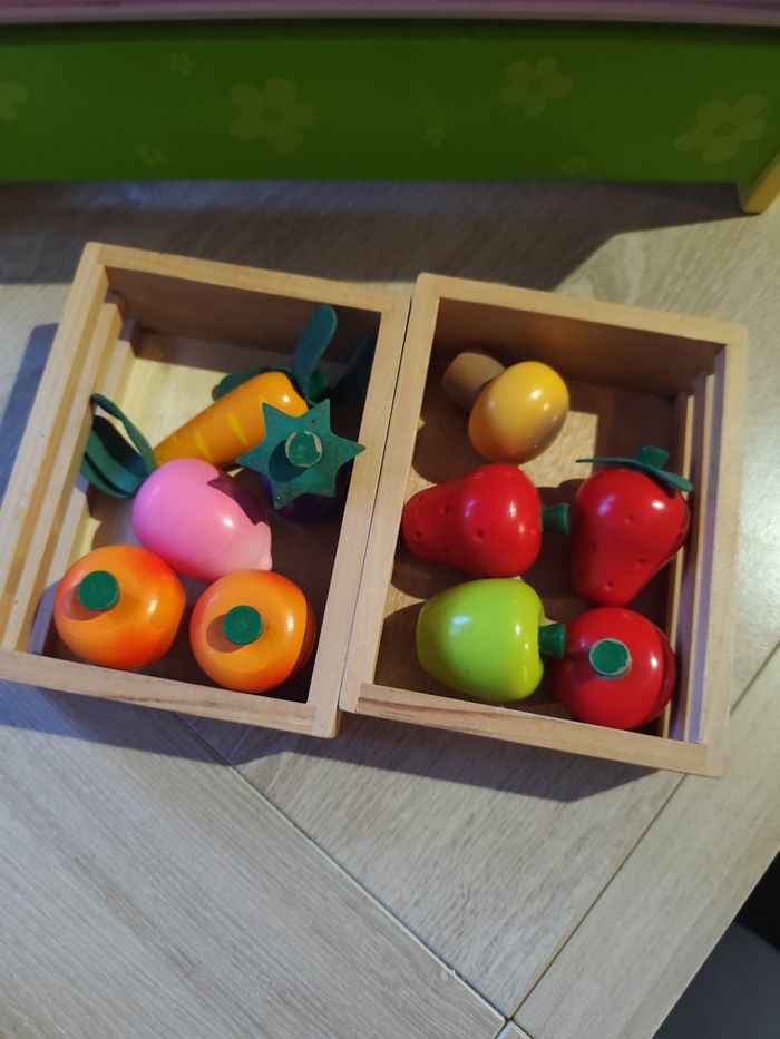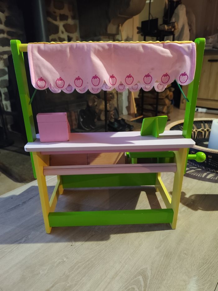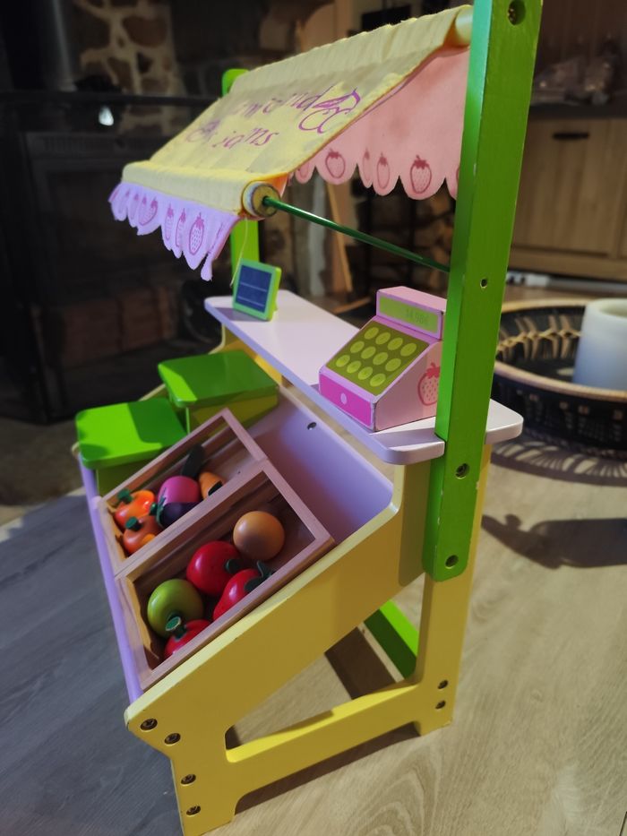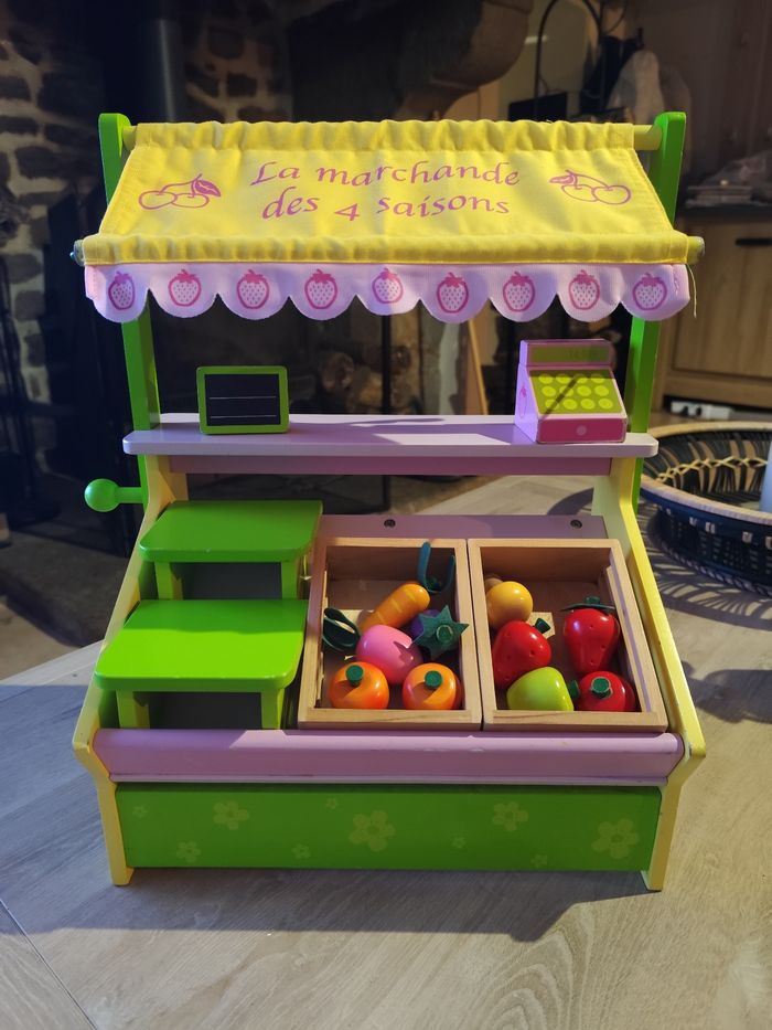 Je vends cette adorable marchande en bois. Cette marchande en bois comprend 2 petits paniers amovibles avec des petits fruits et légumes en bois dedans, un petit présentoir ainsi qu'une petite caisse en bois également ( qui présente de légers défauts, à voir sur les photos )
