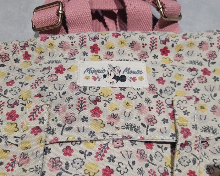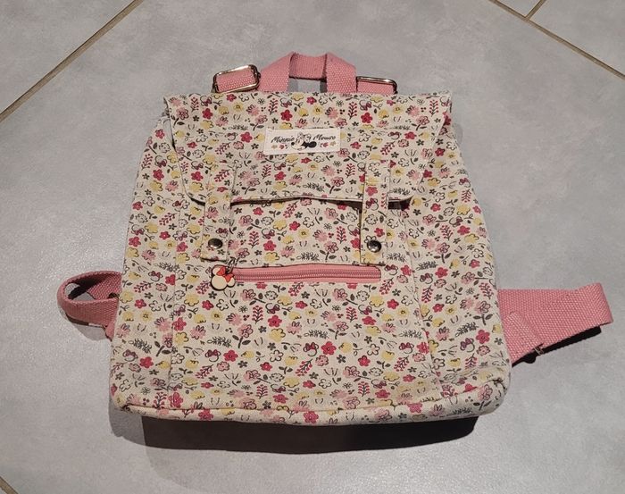 Sac à dos Minnie, fleuri, toile épaisse, en très bon état. Idéal pour la maternelle. Article lavé pour la vente.