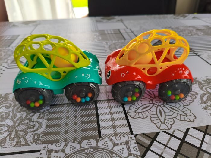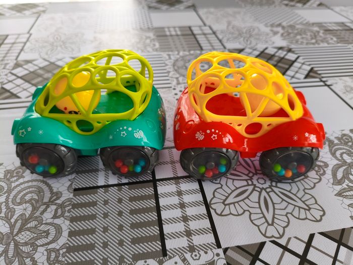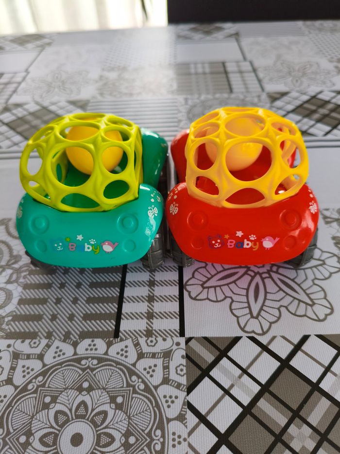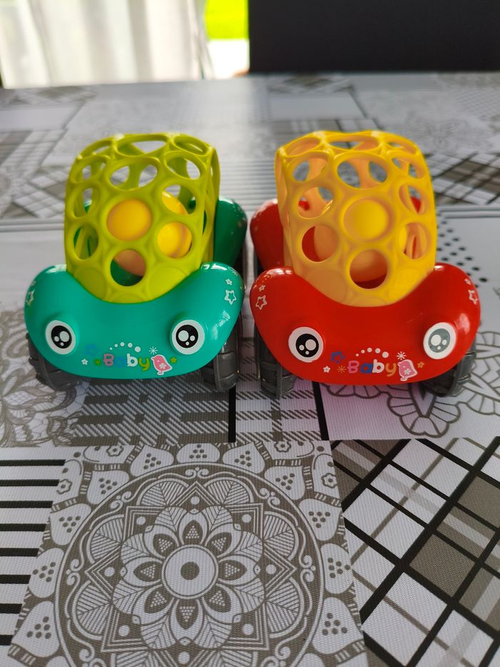 Lot 2 voitures sensorielles 1er âge. Elles sont sympa car pour moi ont 2 fonctions, aident à la motricité et permettent aux plus petits de jouer aux voitures comme les grands. Petite balle hochet a l'intérieur Excellent état