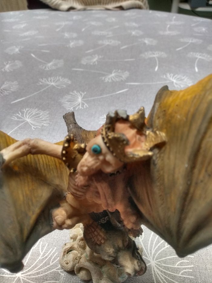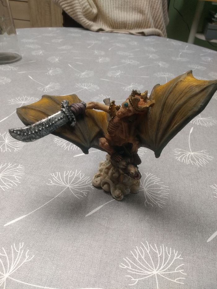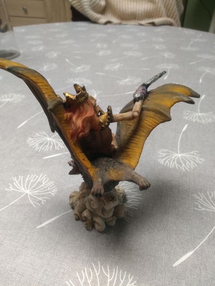 Figurine squelette sur dragon. Dimensions : 17 x 15 cm. Léger défaut sur la couronne voir photo.