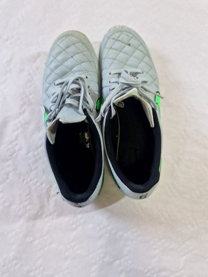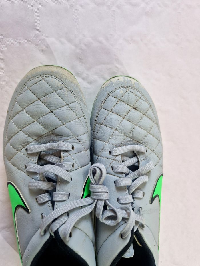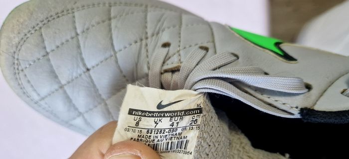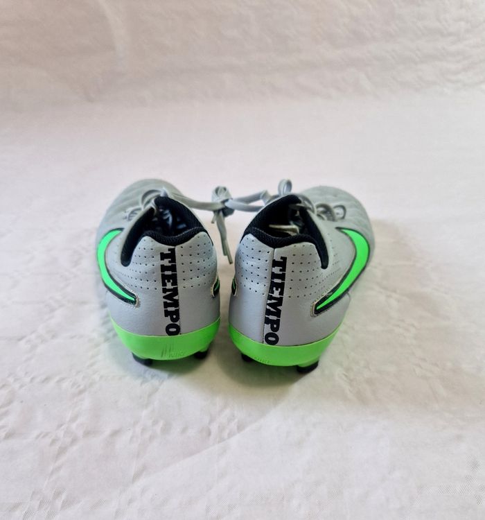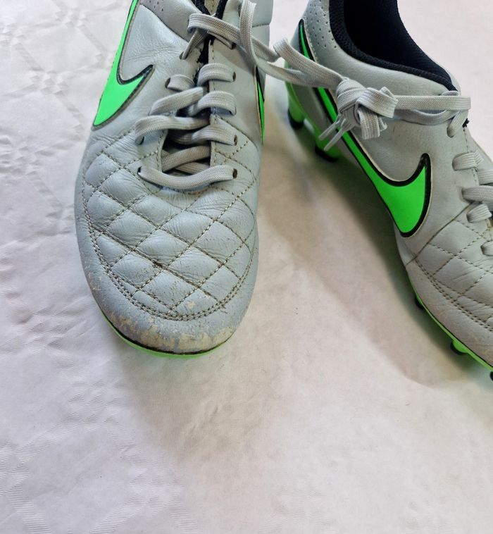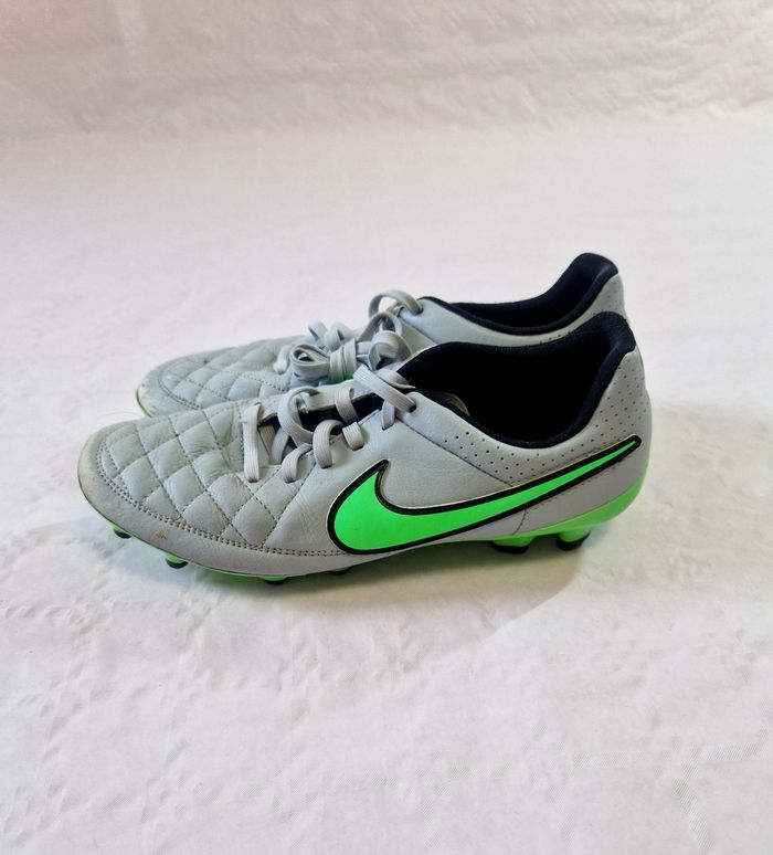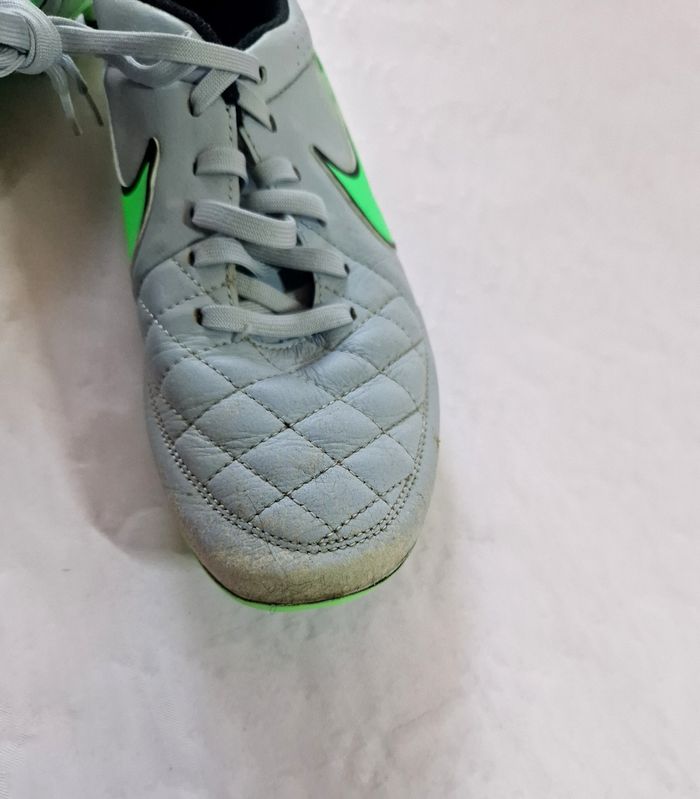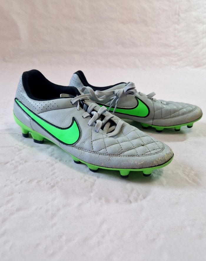 Bonjour , vend chaussures / crampons de foot , homme , de la marque Nike , modèle Tiempo Genio Leather AG , pointure 41 , -Gris Loup/ Vert , bon état , usure au bout des chaussures , du a une utilisation sur le terrain #foot #football #sport #sportswear #homme #man #men #chaussures #basket #sneakers #crampons