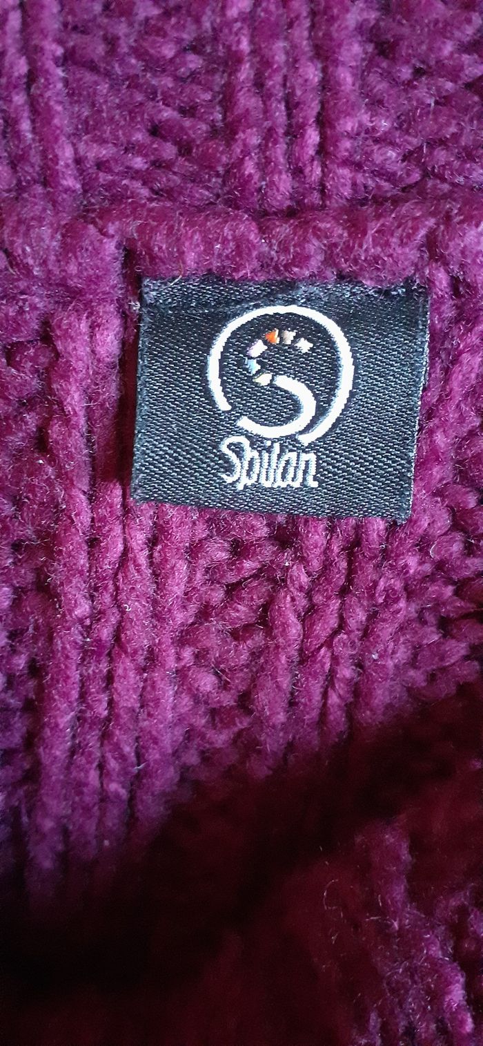 Vends un pull en maille 100 % acrylique, col arrondi montant, couleur prune, marque Spilan, taille 38-40.