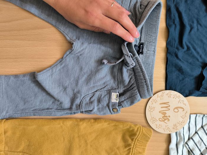 - en bas à gauche : pantalon gris bleu Kiabi en très bon état