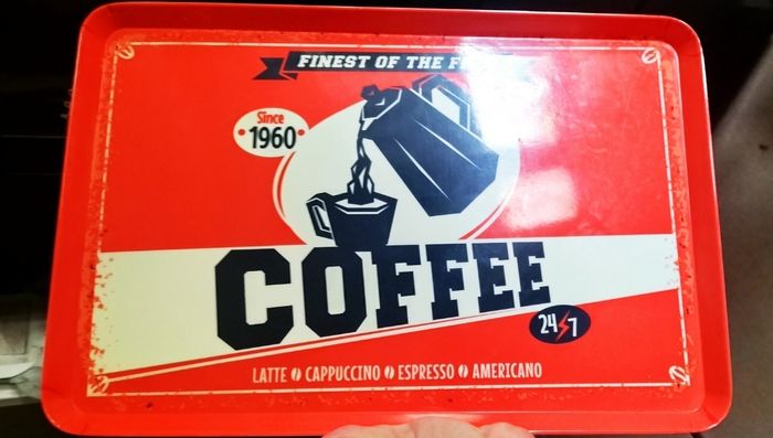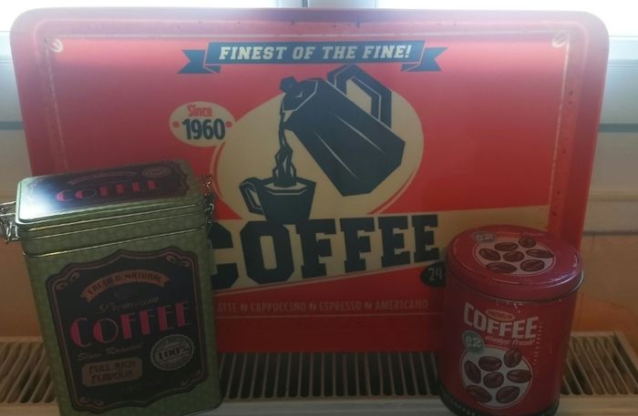 lot d'accessoires de cuisine et de café, comprenant un plateau plastique , une boîte pour le café et une boîte rose en metal pour dosettes - Type de produit : Lot d'accessoires de cuisine et de café - Matière : Métal - Composition du lot : Plateau, boîte à café, boîte de rangement Très bon état 9€90