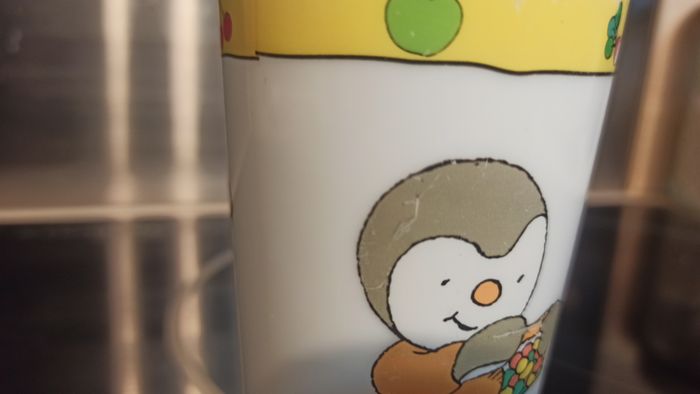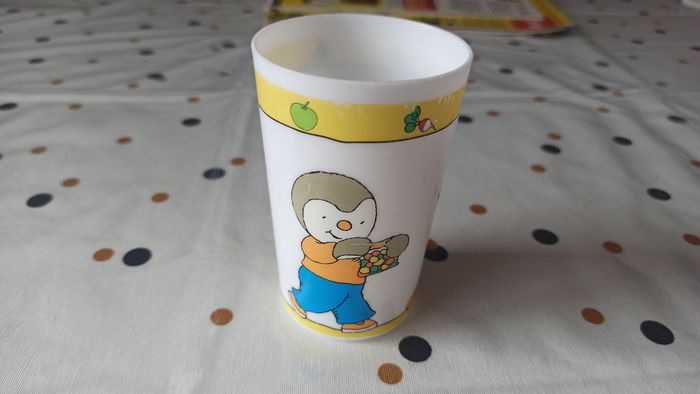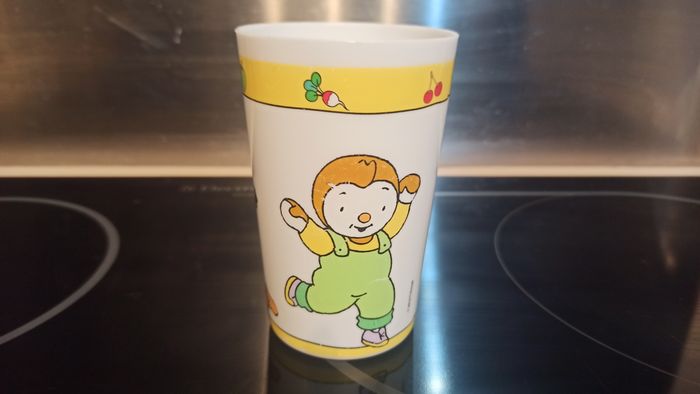 Verre en plastique T'choupi. Dessin un peu craquelé par endroit (voir dernière photo)